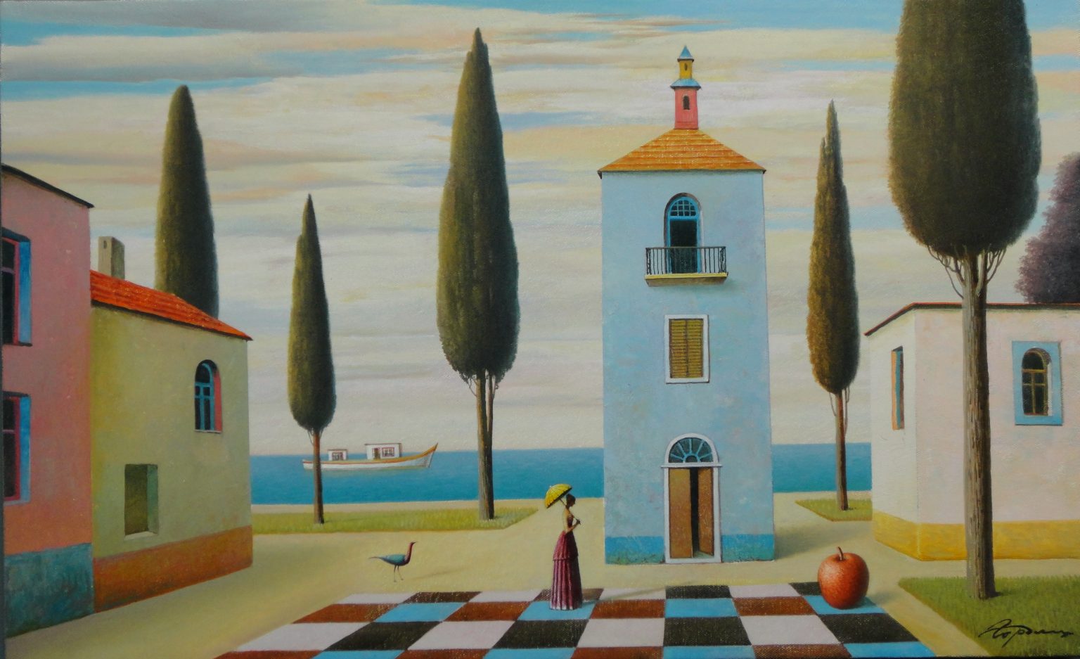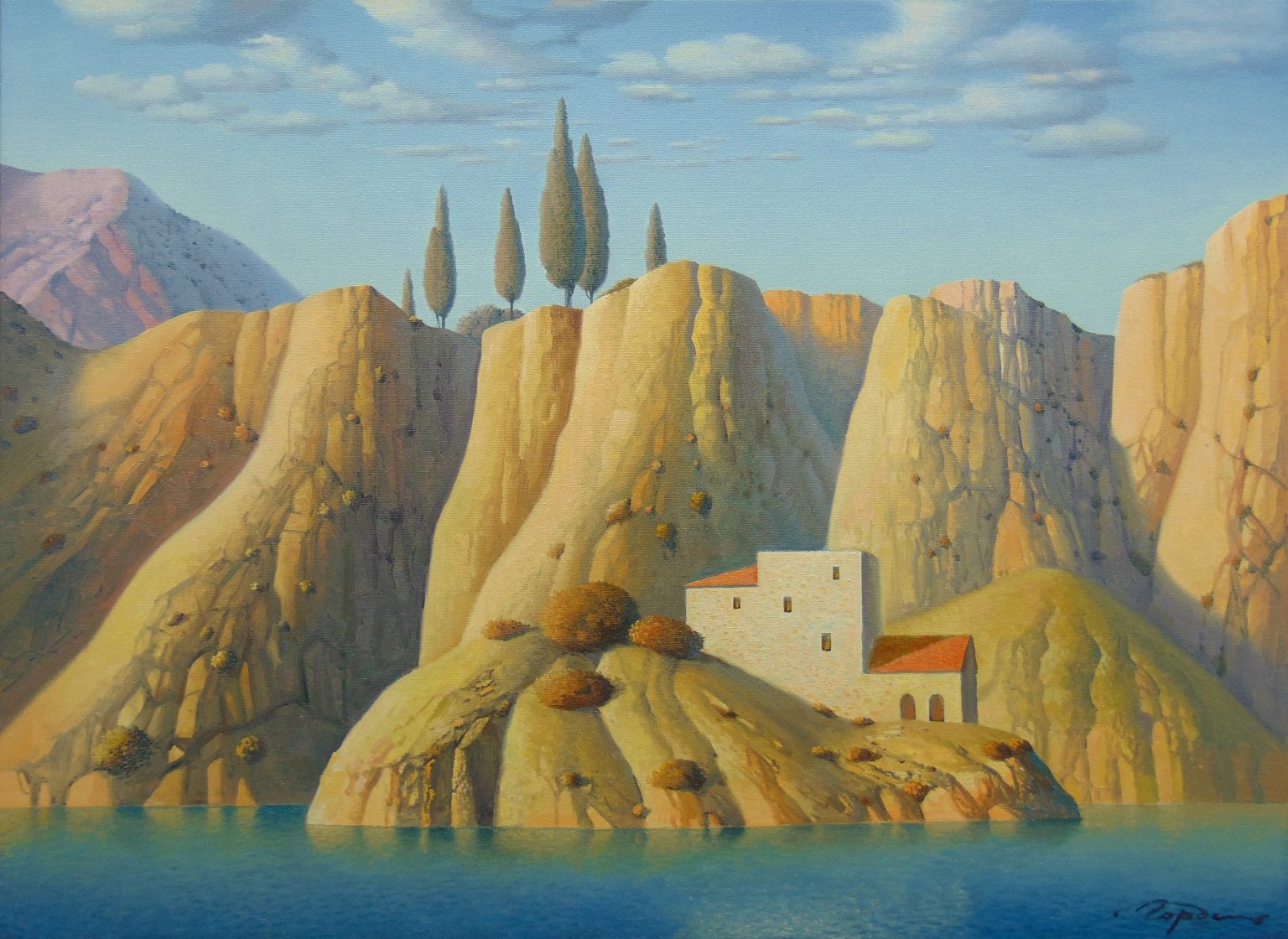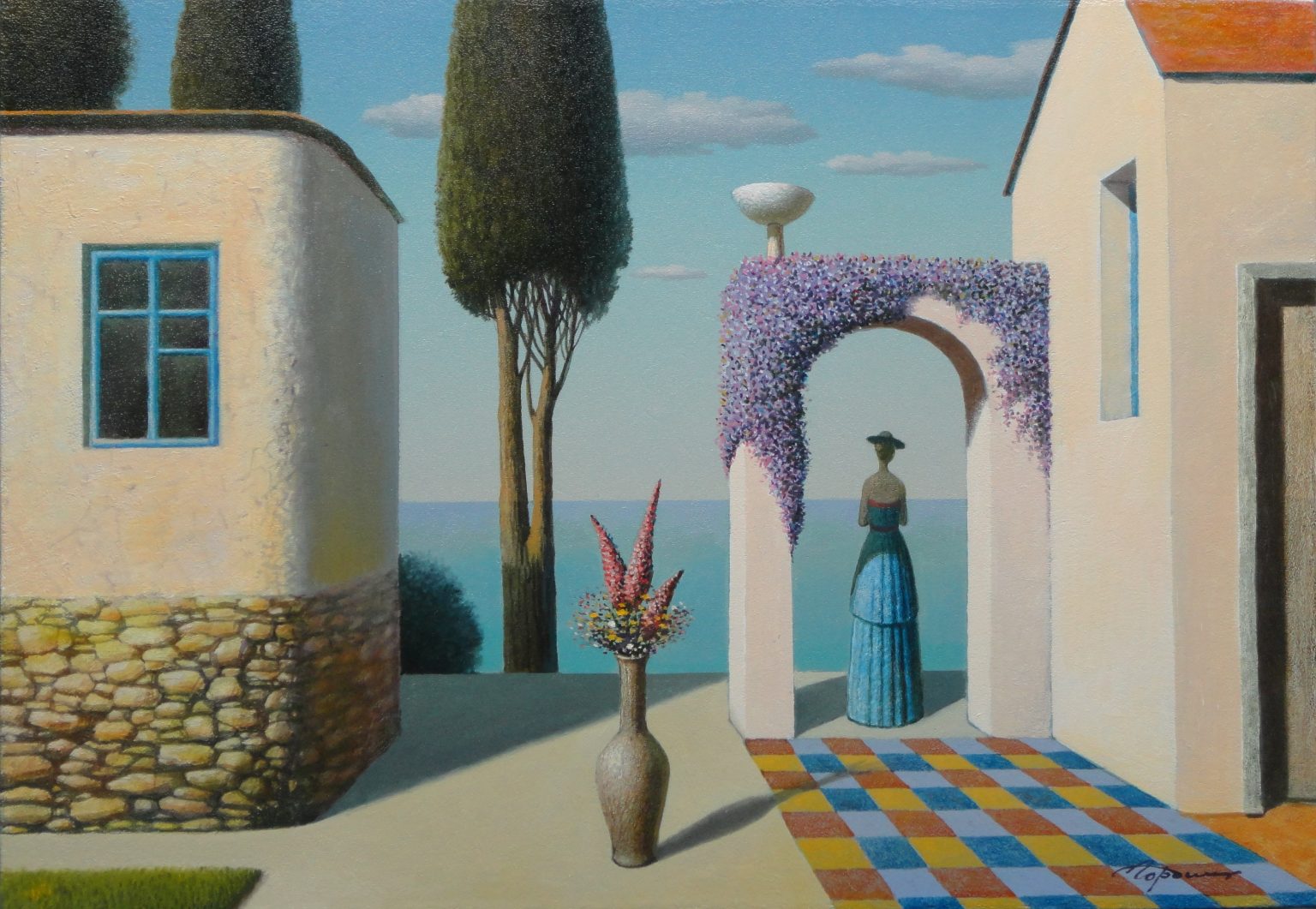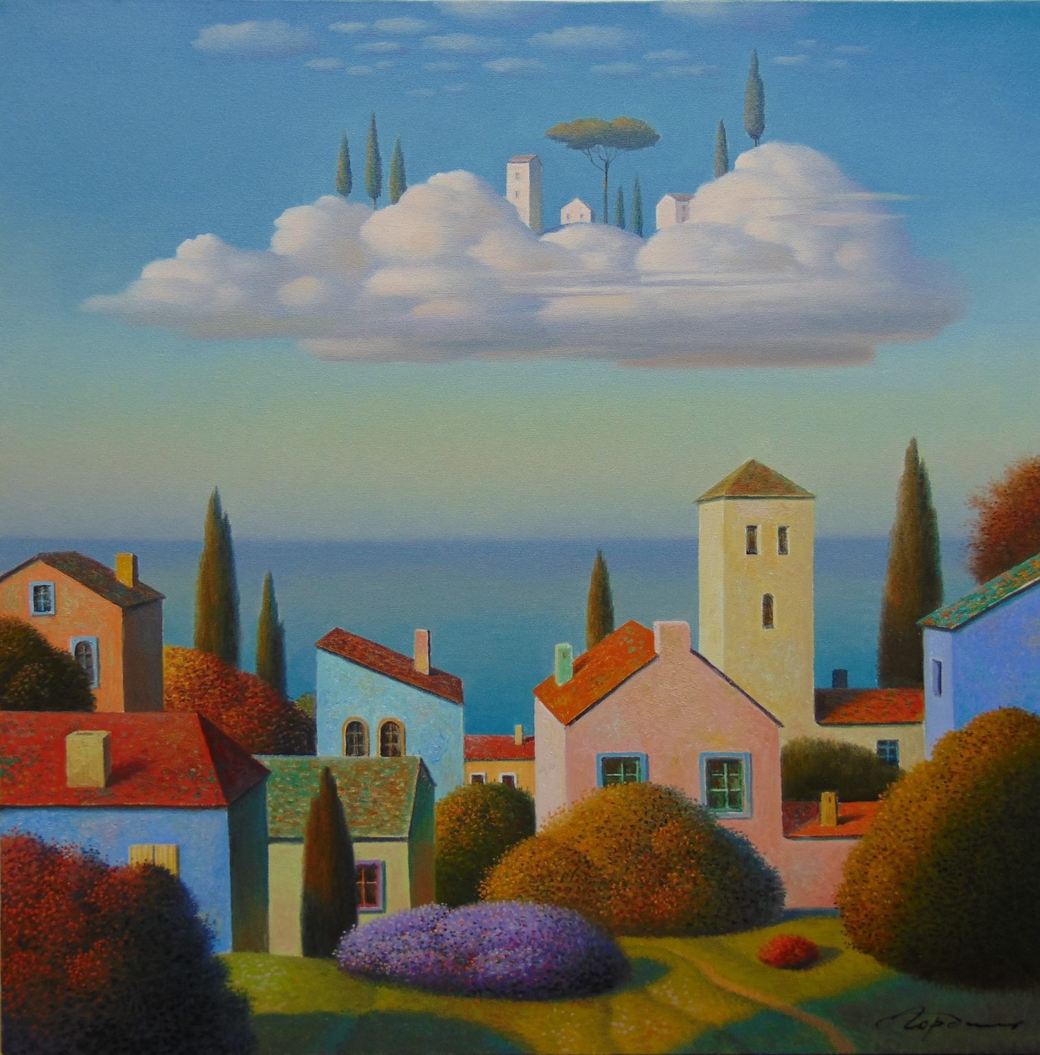 Wikipedia dixit: “Eugene Gordiets is known as a surrealist artist. He writes in genres of landscape and still life. His work is compared with the works of the French artists Pierre Puvis de Chavannes and René Magritte.” (Oh, Eugene, toldya.)