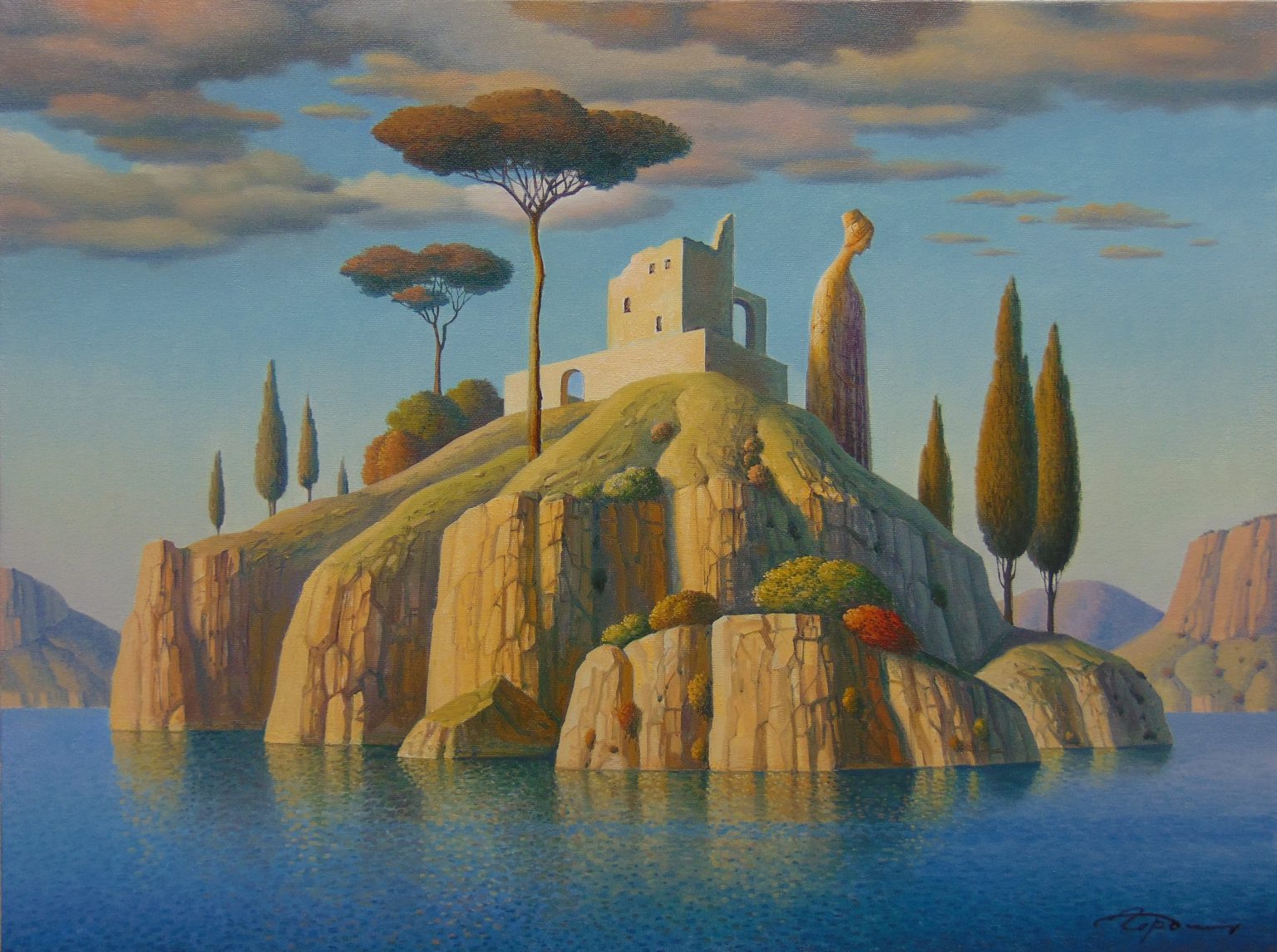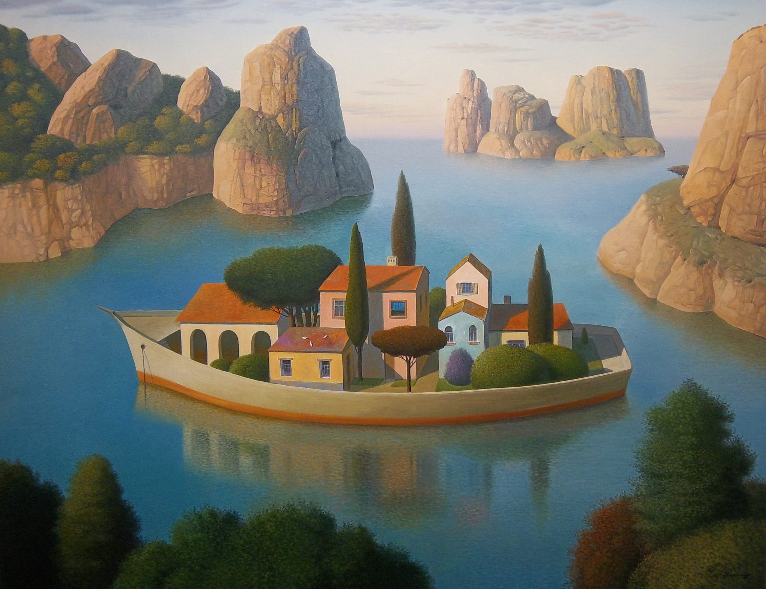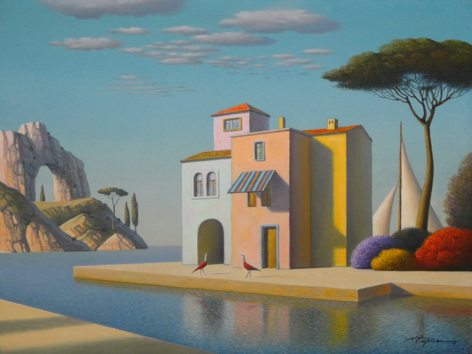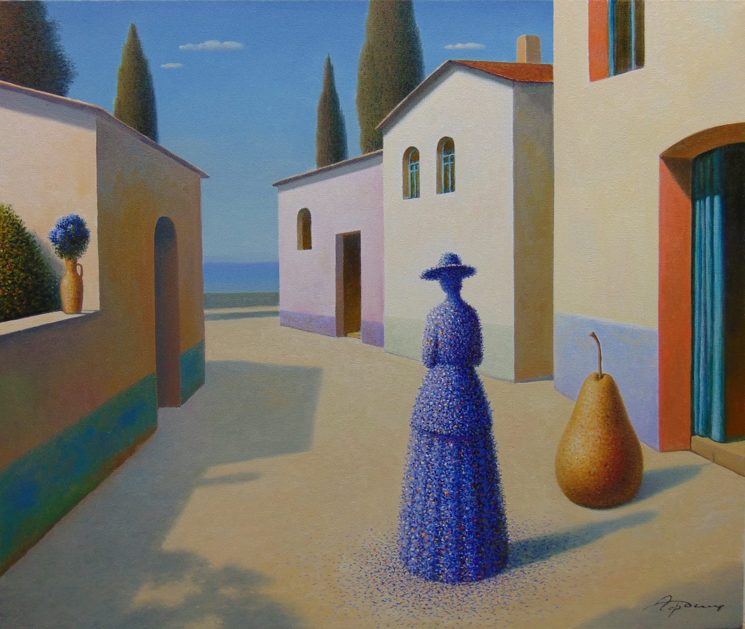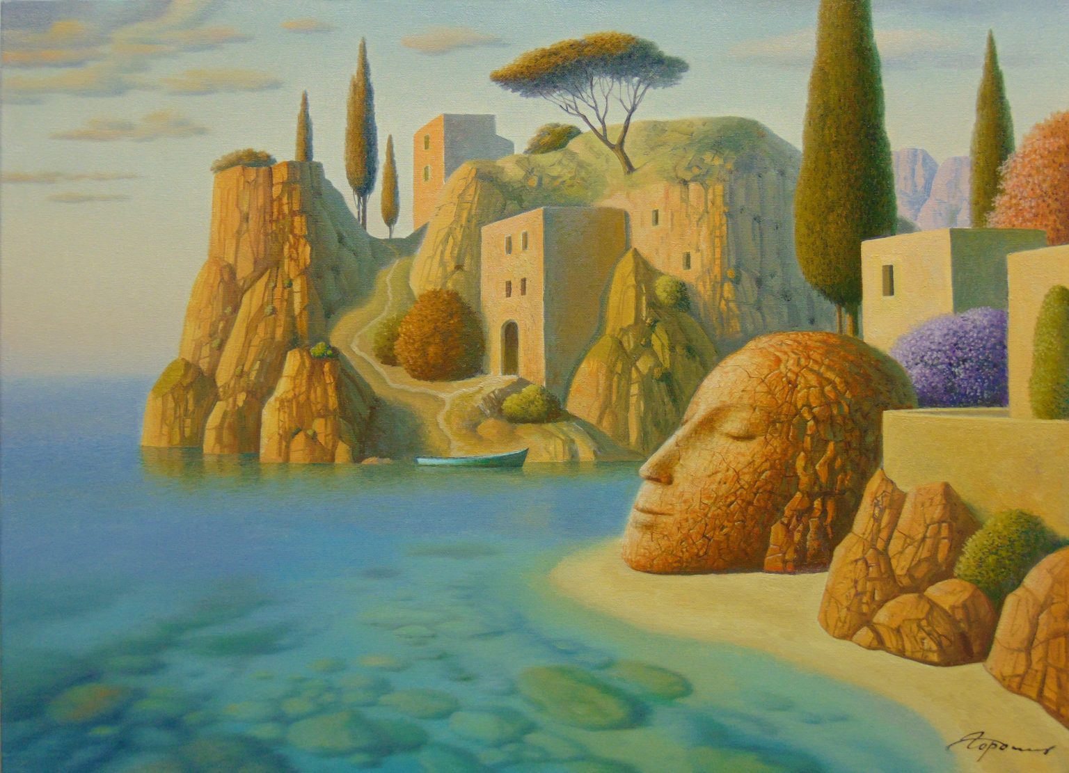 Wikipedia dixit: “Eugene Gordiets is known as a surrealist artist. He writes in genres of landscape and still life. His work is compared with the works of the French artists Pierre Puvis de Chavannes and René Magritte.” (Oh, Eugene, toldya.)