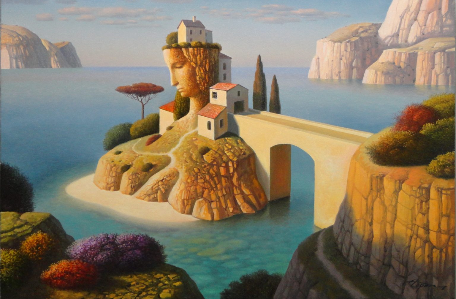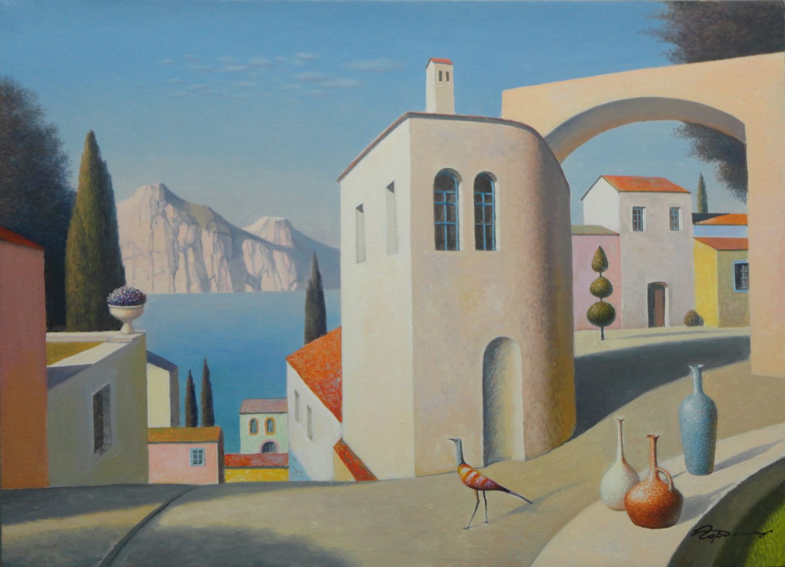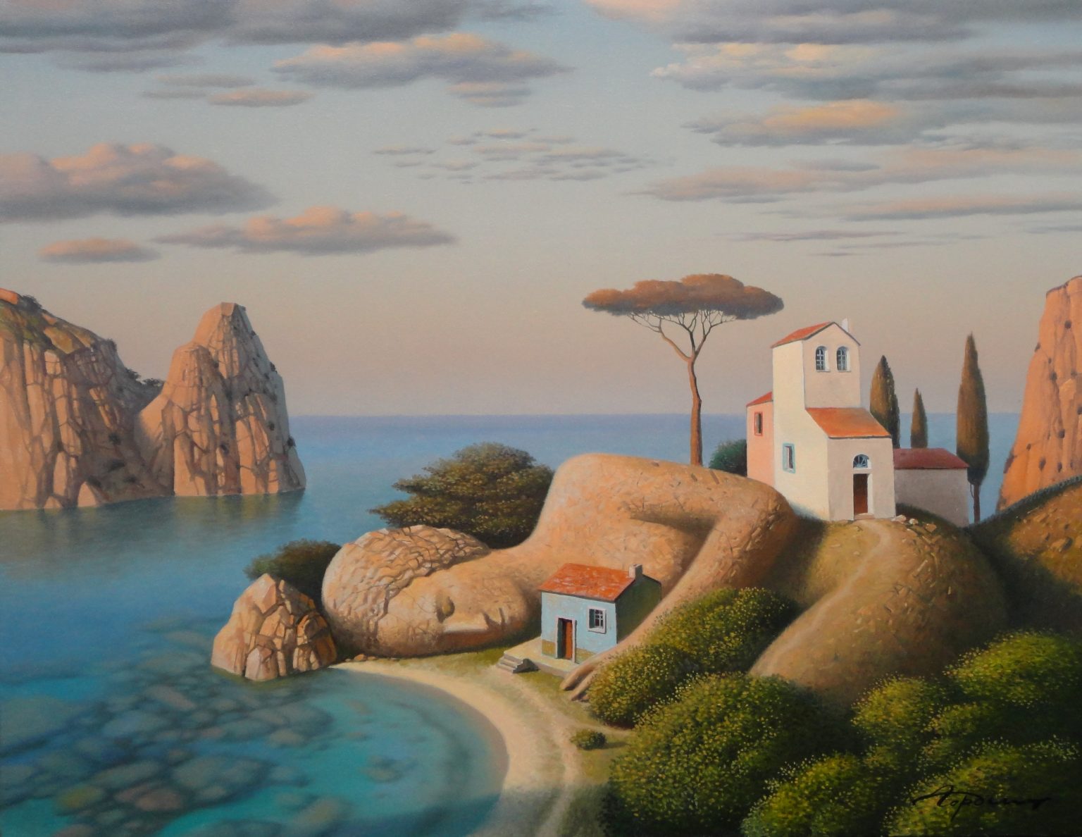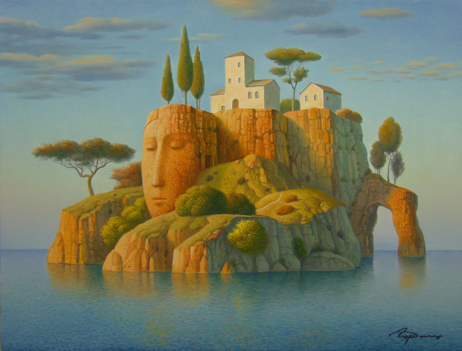 Wikipedia dixit: “Eugene Gordiets is known as a surrealist artist. He writes in genres of landscape and still life. His work is compared with the works of the French artists Pierre Puvis de Chavannes and René Magritte.” (Oh, Eugene, toldya.)