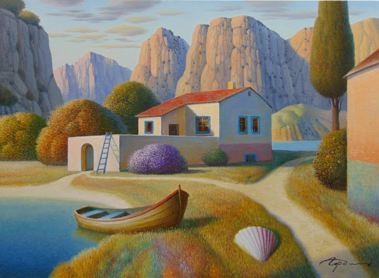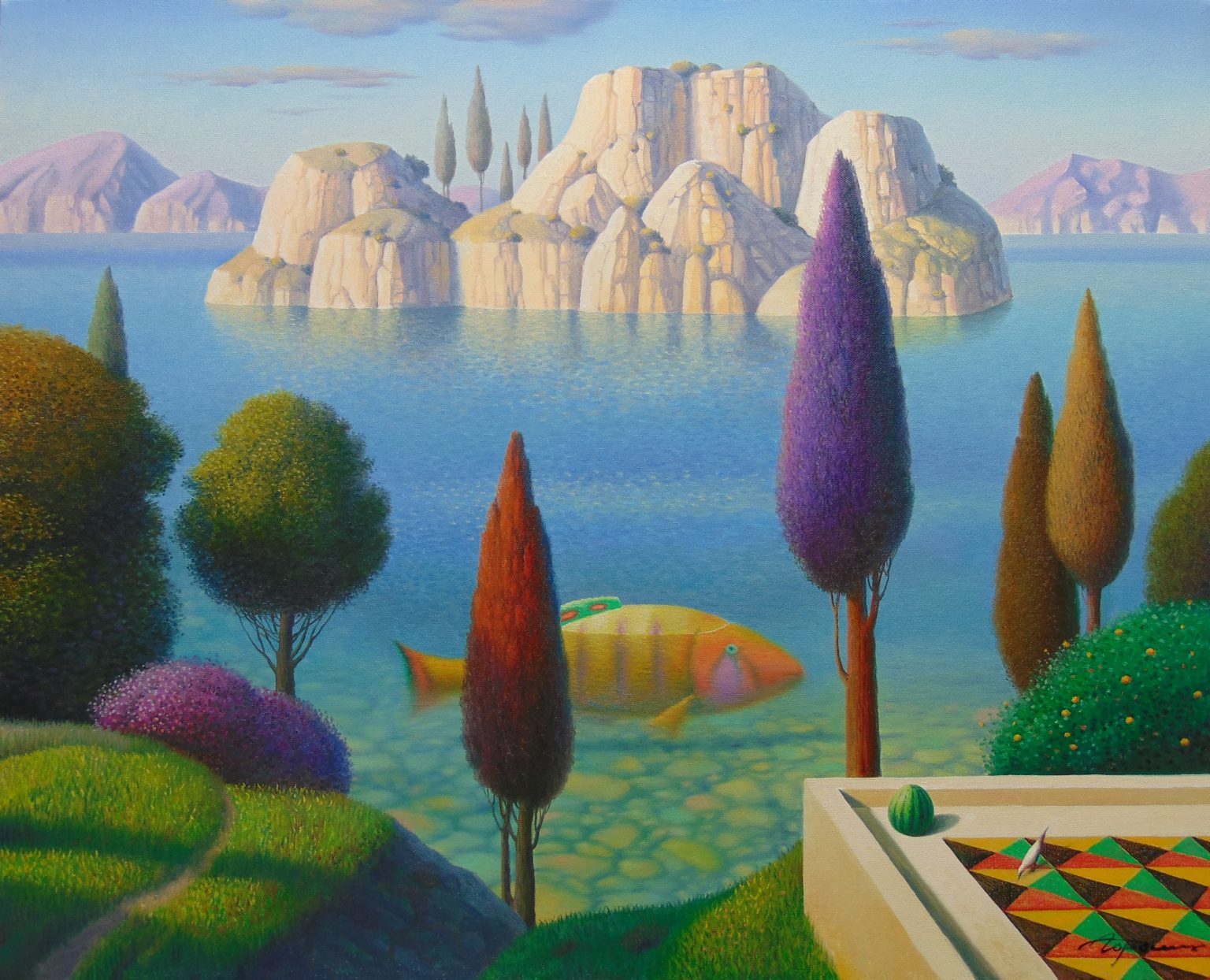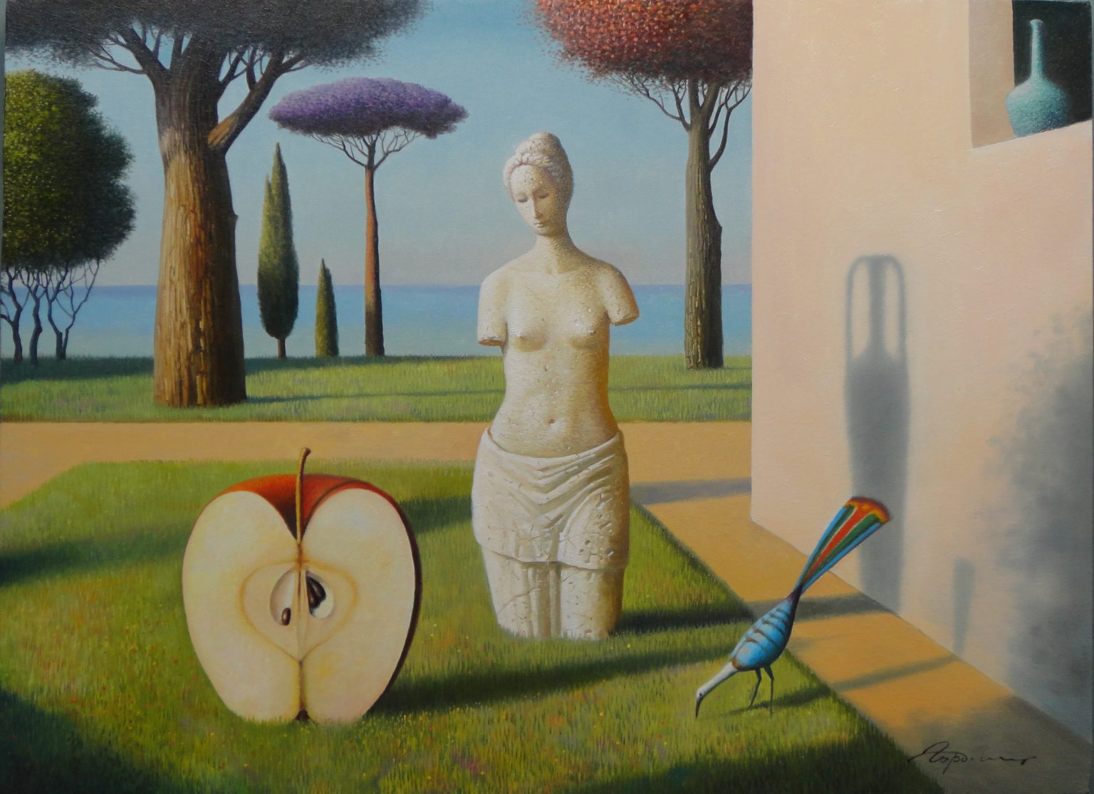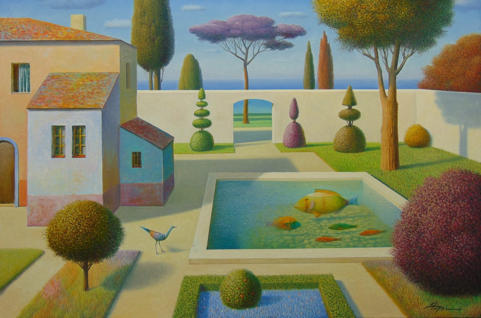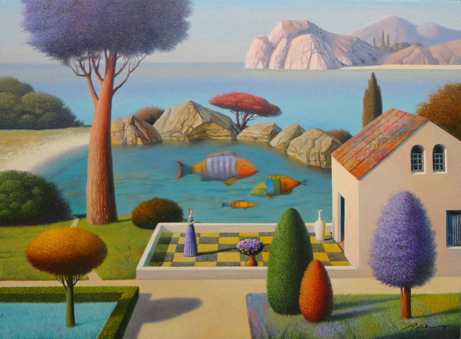 You’ll find below a quick selection from Evgeni’s website. I avoided the purely abstract ones, as well as the still life. I included a couple of pointillistic ones, and even from this sample, I guess one can notice the recurrent themes: Mediterranean-like landscapes, shapes of women in the rocks, peacocks, apples, fish, and the very specific way of representing the trees, the women, the houses. Now you tell me which painters have influenced пан Гордієць (or is it пана Гордієця?).