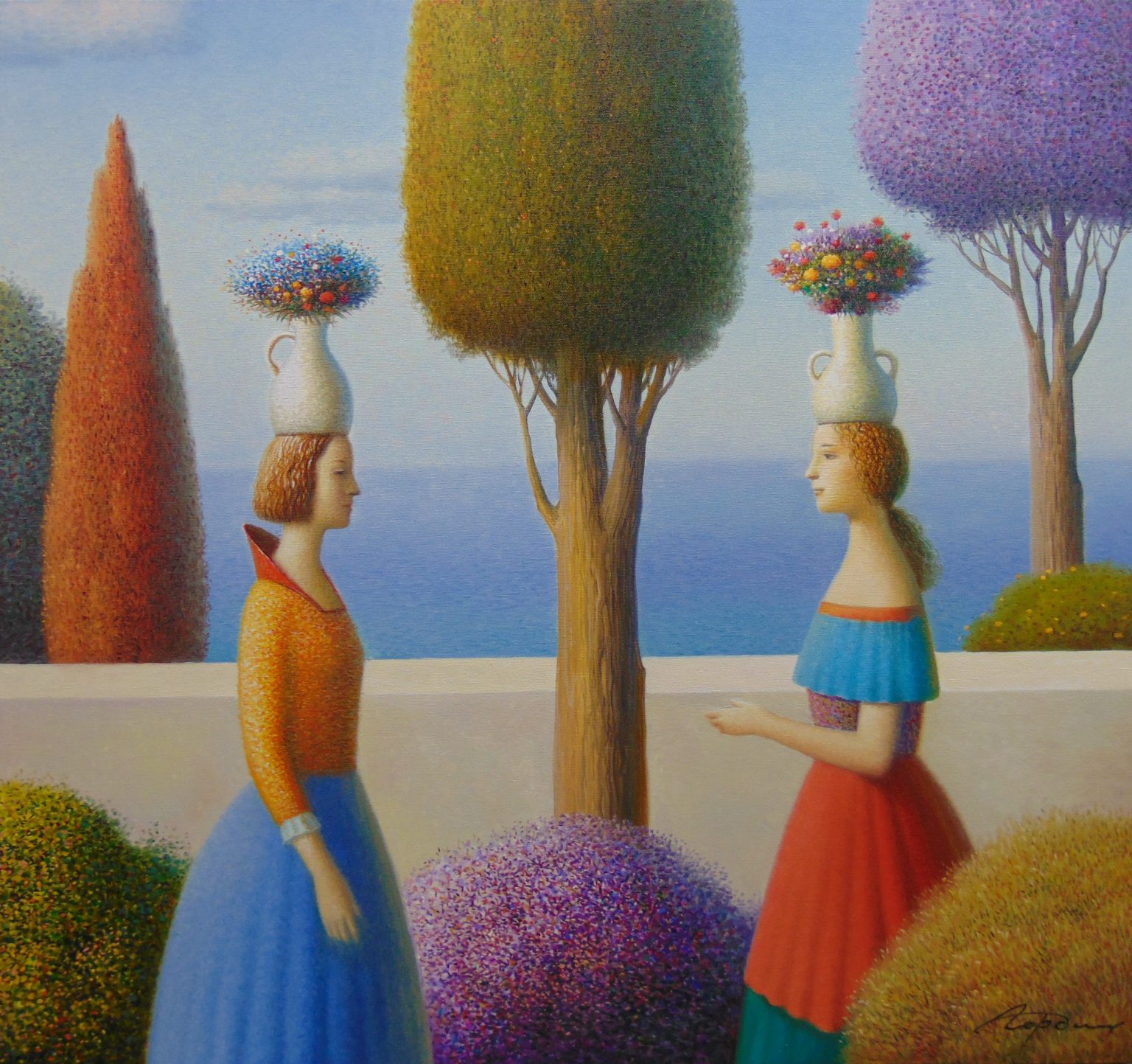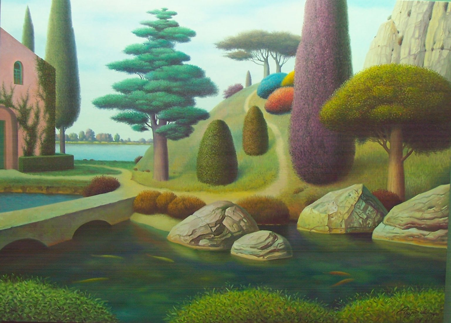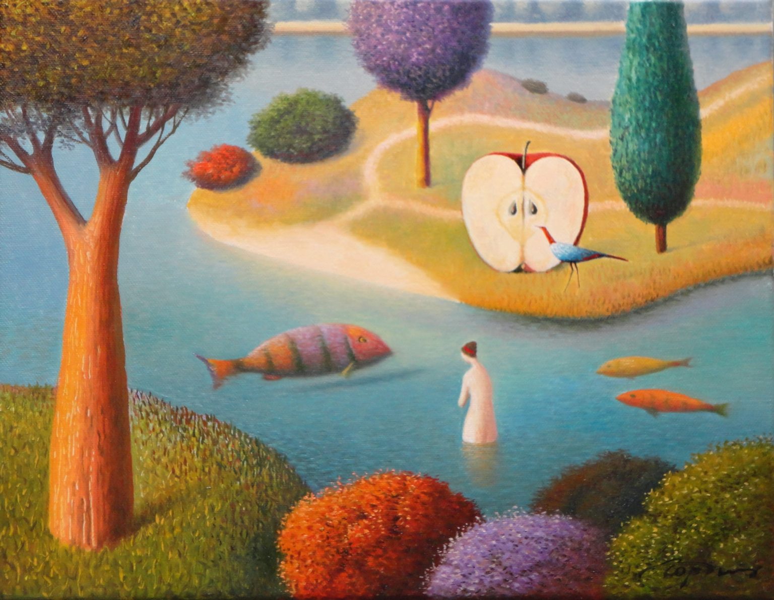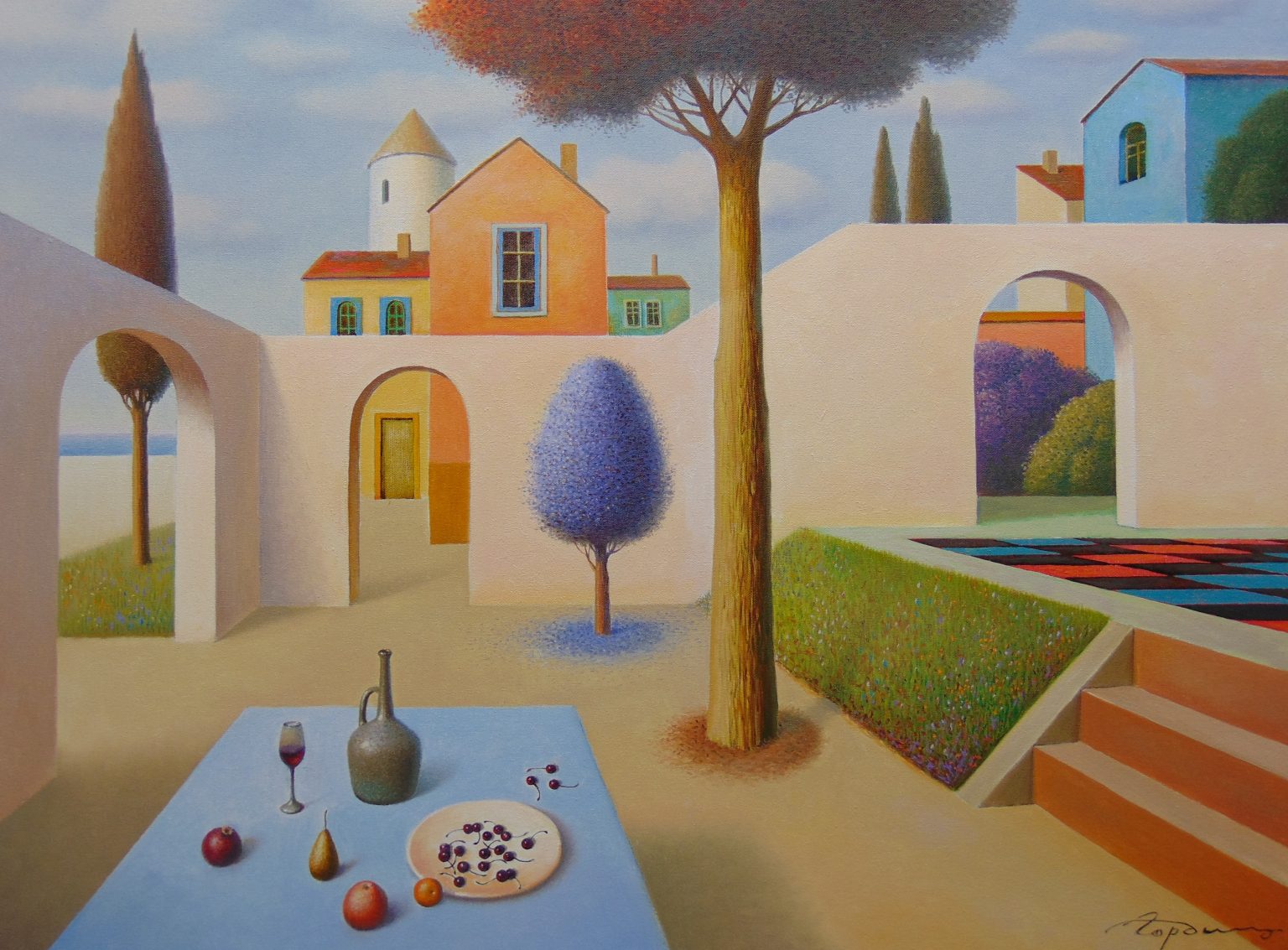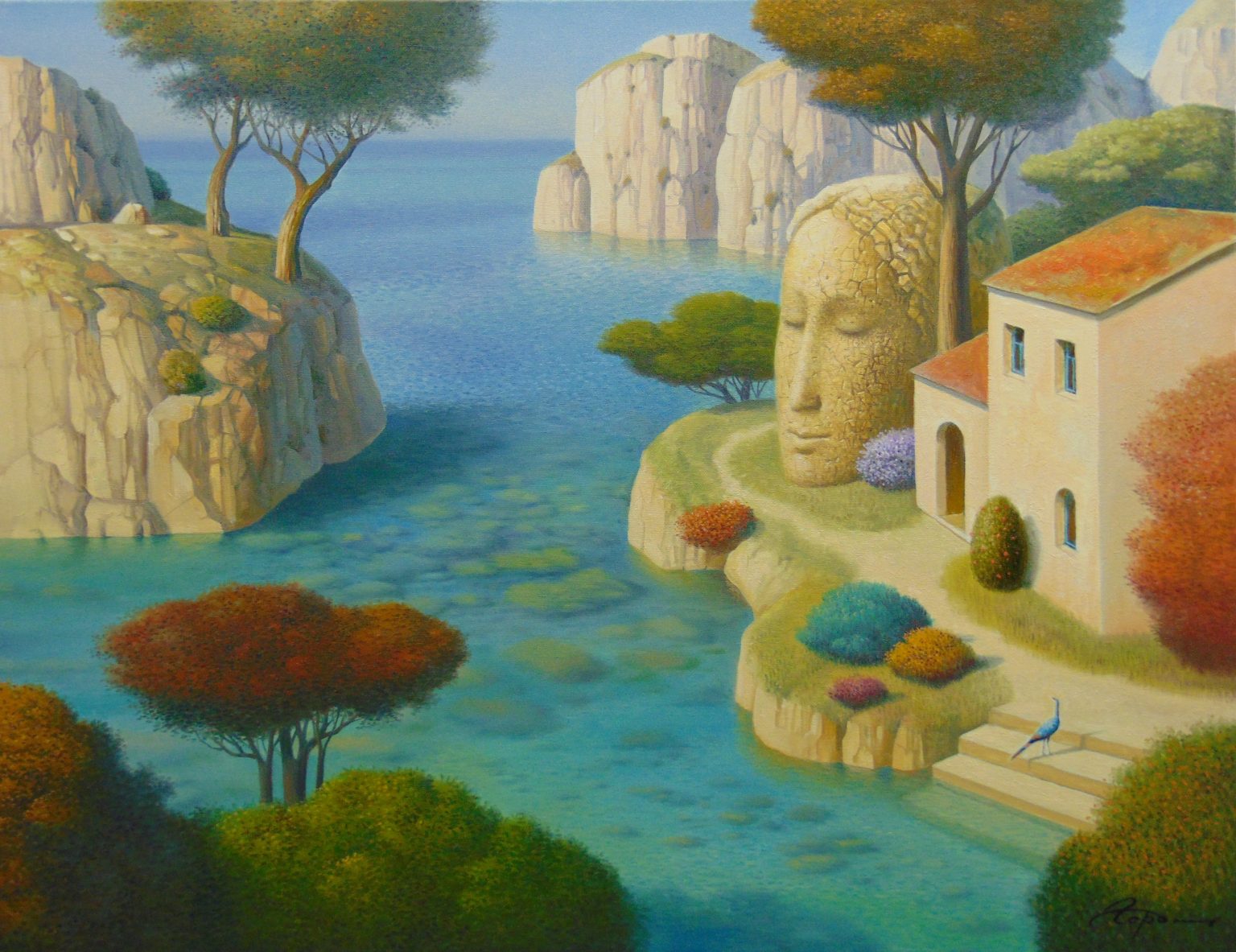 You’ll find below a quick selection from Evgeni’s website. I avoided the purely abstract ones, as well as the still life. I included a couple of pointillistic ones, and even from this sample, I guess one can notice the recurrent themes: Mediterranean-like landscapes, shapes of women in the rocks, peacocks, apples, fish, and the very specific way of representing the trees, the women, the houses. Now you tell me which painters have influenced пан Гордієць (or is it пана Гордієця?).