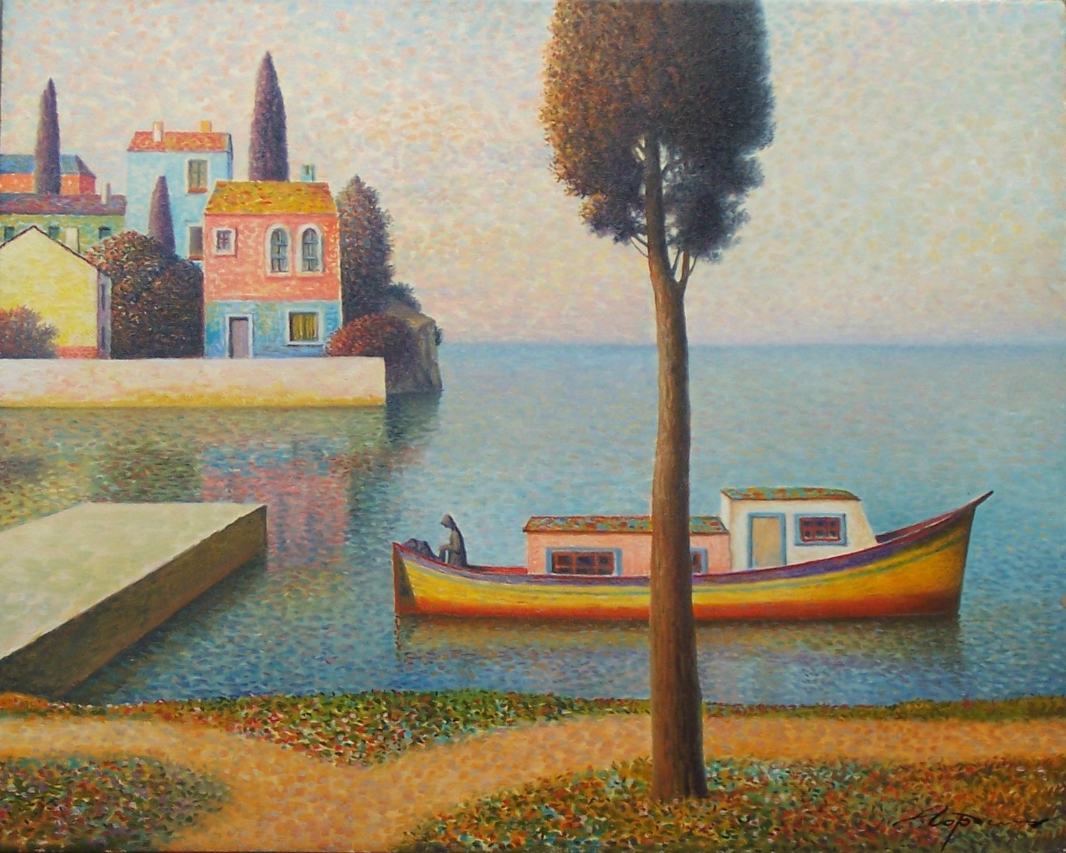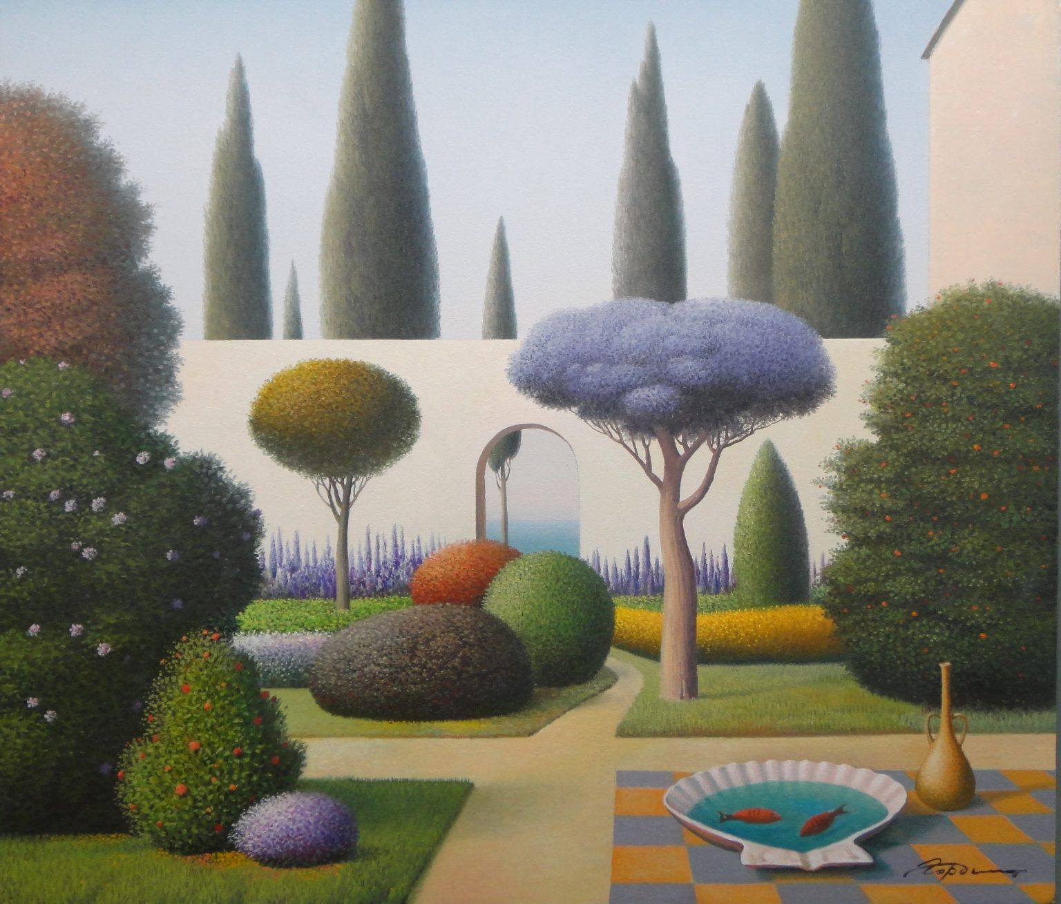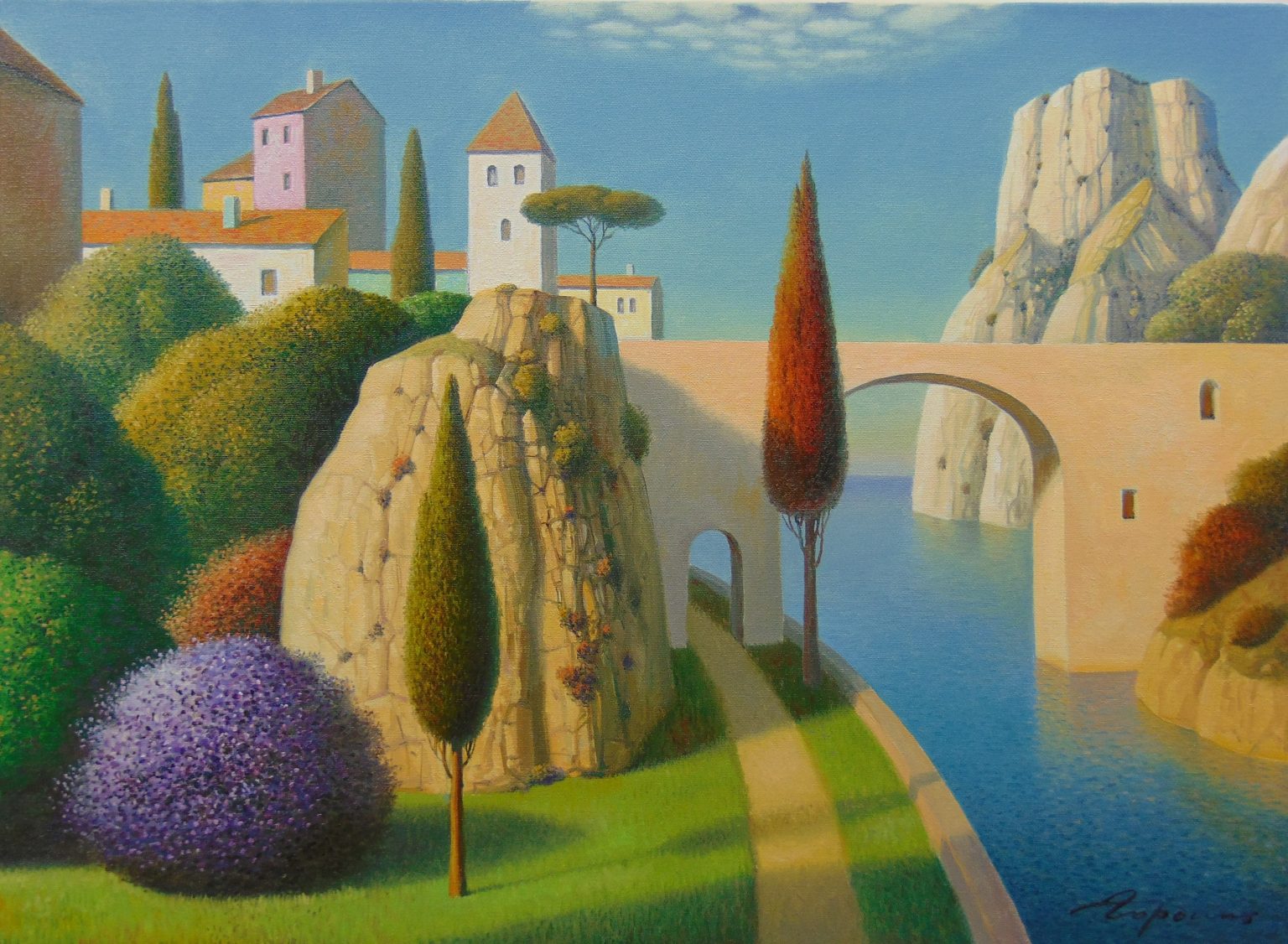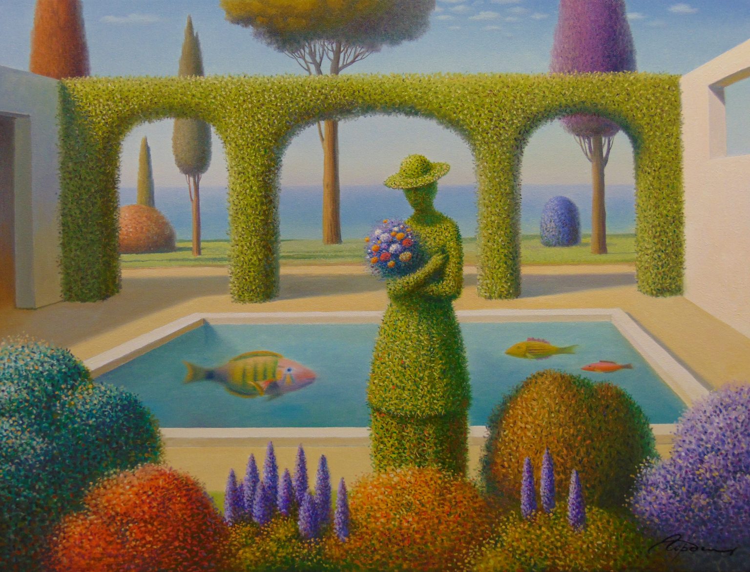 You’ll find below a quick selection from Evgeni’s website. I avoided the purely abstract ones, as well as the still life. I included a couple of pointillistic ones, and even from this sample, I guess one can notice the recurrent themes: Mediterranean-like landscapes, shapes of women in the rocks, peacocks, apples, fish, and the very specific way of representing the trees, the women, the houses. Now you tell me which painters have influenced пан Гордієць (or is it пана Гордієця?).