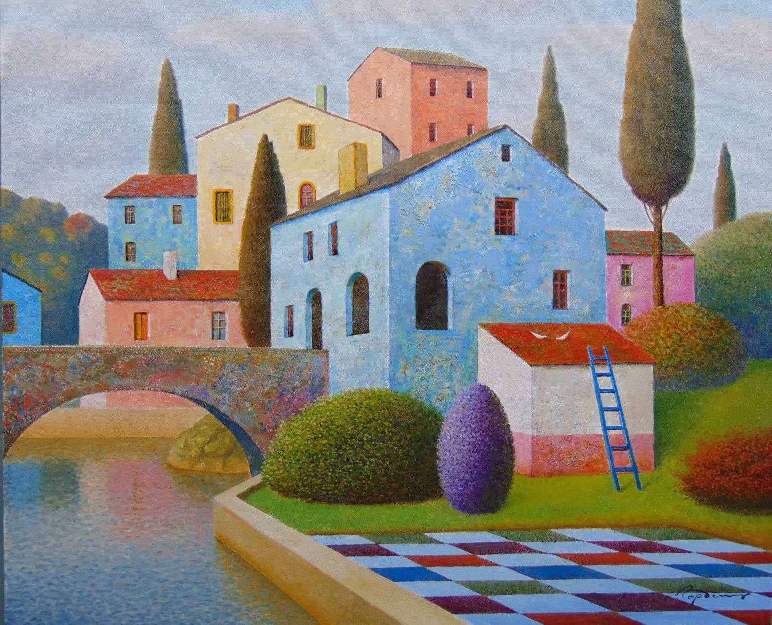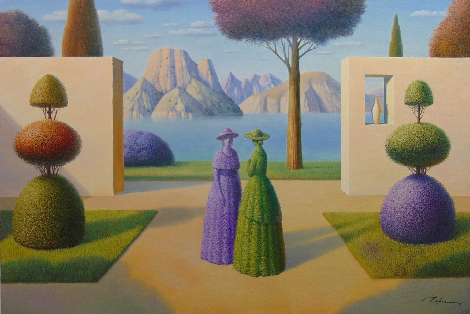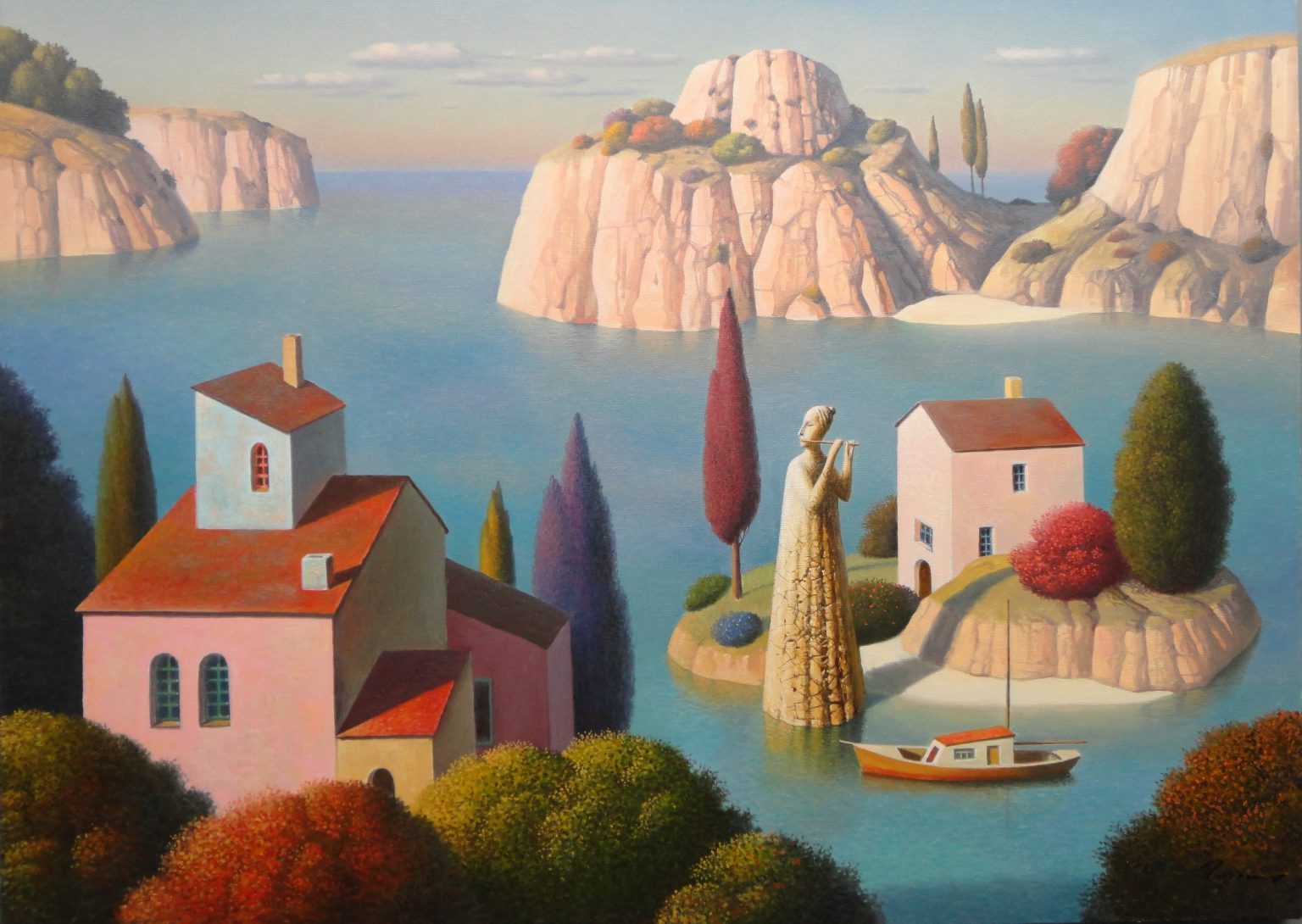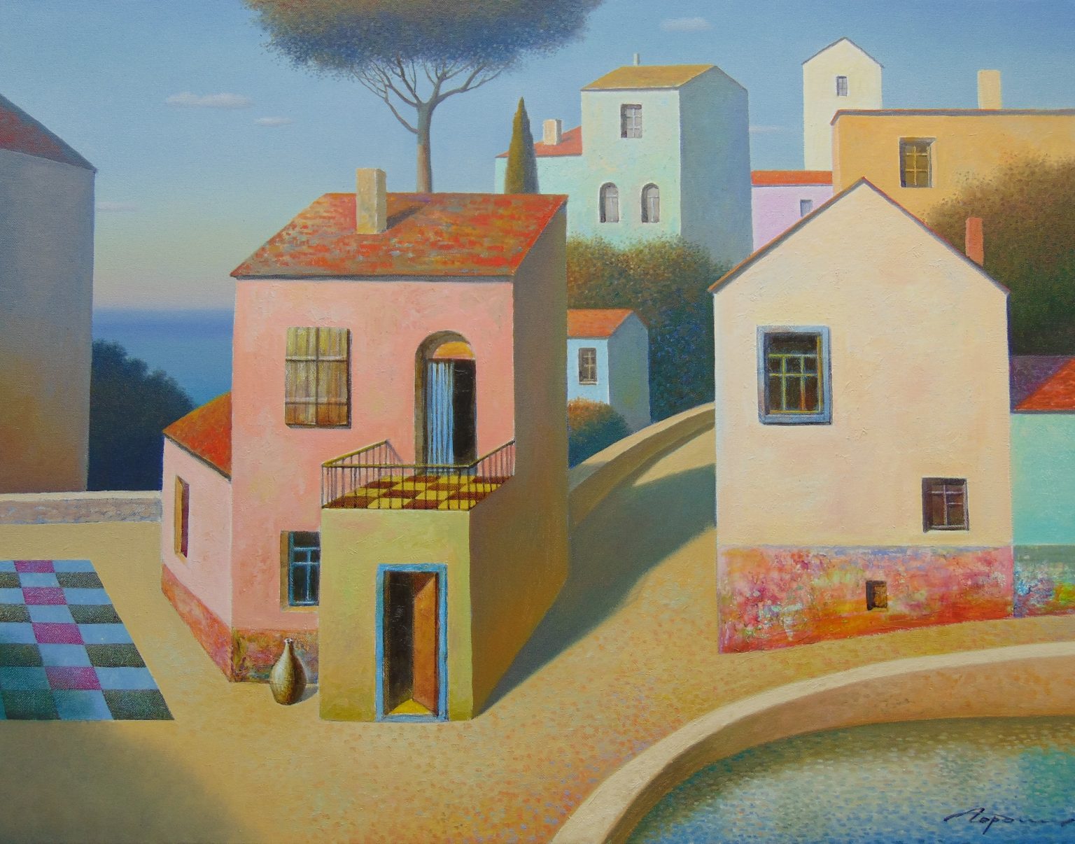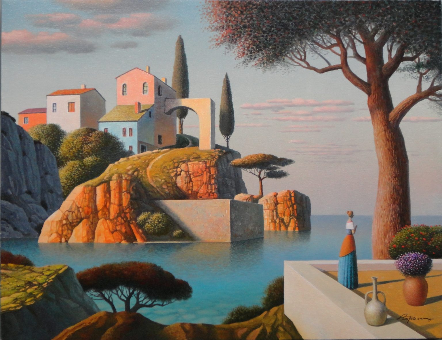 You’ll find below a quick selection from Evgeni’s website. I avoided the purely abstract ones, as well as the still life. I included a couple of pointillistic ones, and even from this sample, I guess one can notice the recurrent themes: Mediterranean-like landscapes, shapes of women in the rocks, peacocks, apples, fish, and the very specific way of representing the trees, the women, the houses. Now you tell me which painters have influenced пан Гордієць (or is it пана Гордієця?).