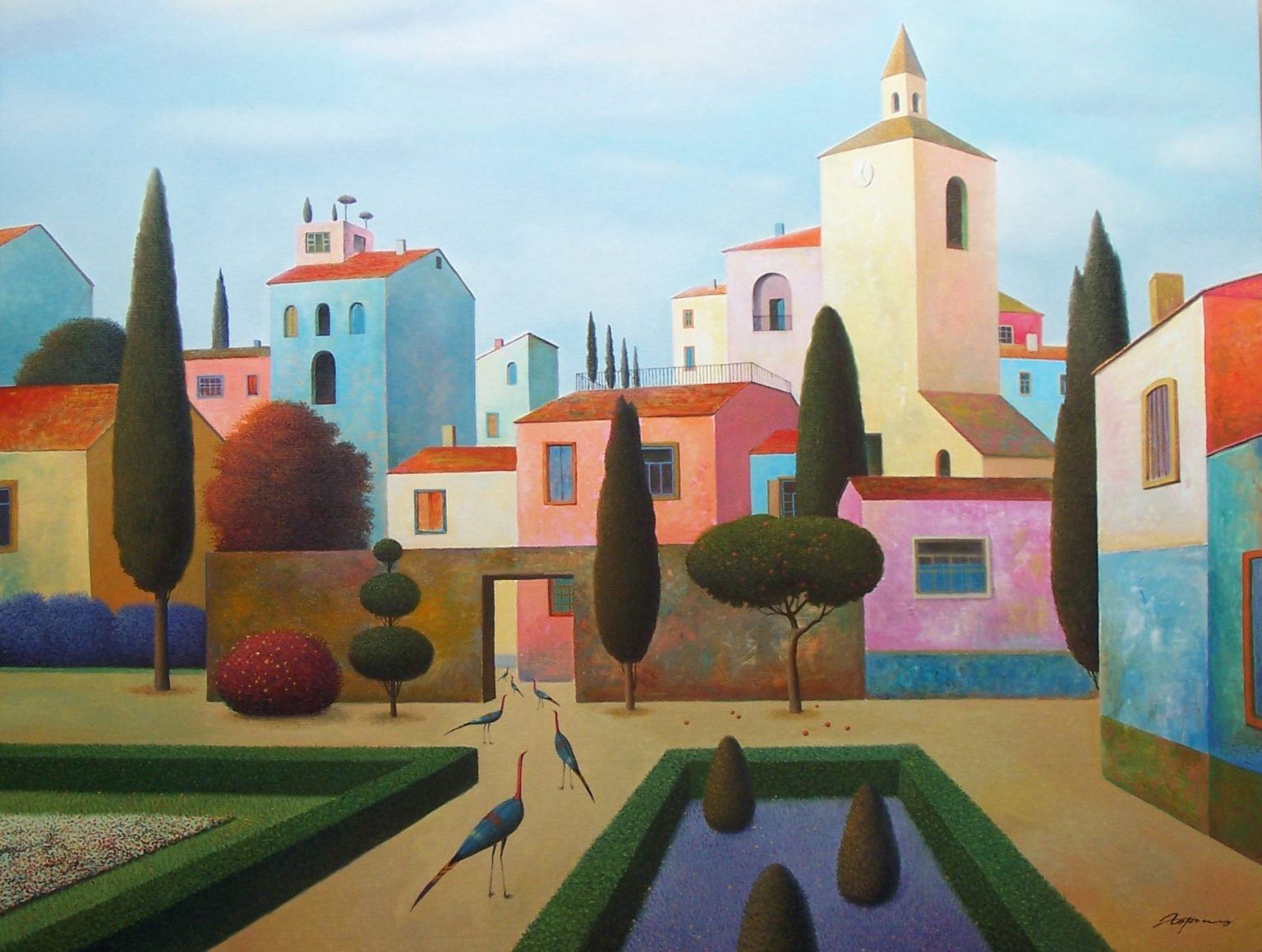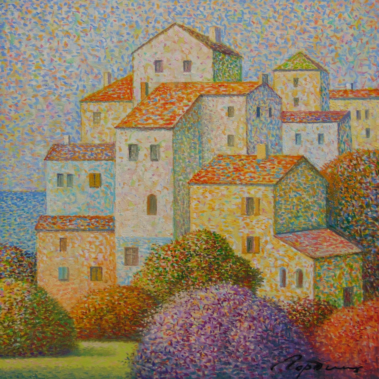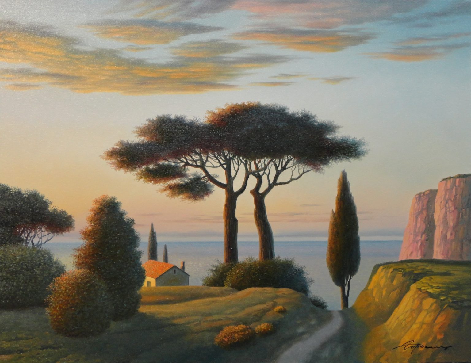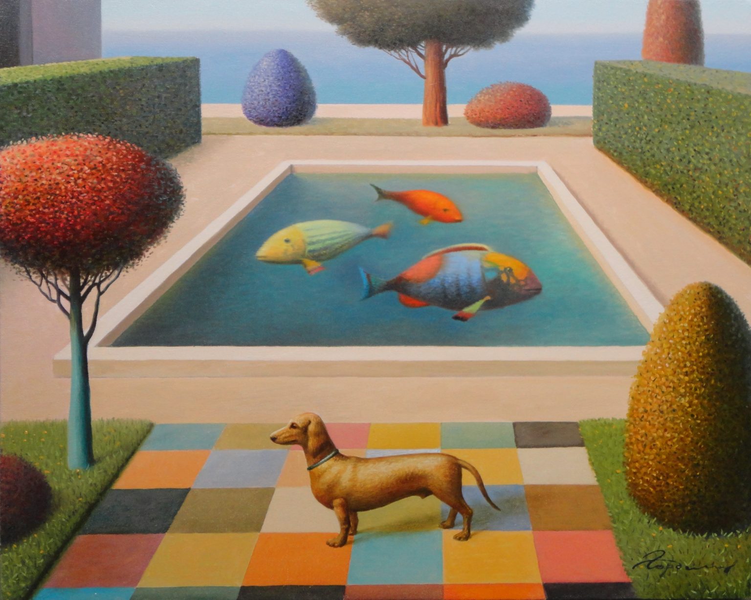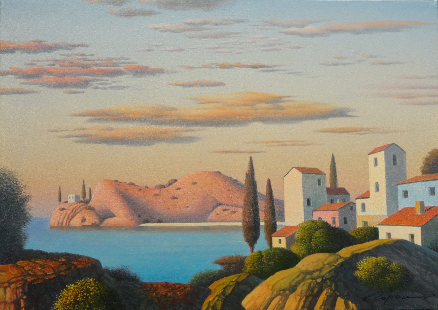 You’ll find below a quick selection from Evgeni’s website. I avoided the purely abstract ones, as well as the still life. I included a couple of pointillistic ones, and even from this sample, I guess one can notice the recurrent themes: Mediterranean-like landscapes, shapes of women in the rocks, peacocks, apples, fish, and the very specific way of representing the trees, the women, the houses. Now you tell me which painters have influenced пан Гордієць (or is it пана Гордієця?).