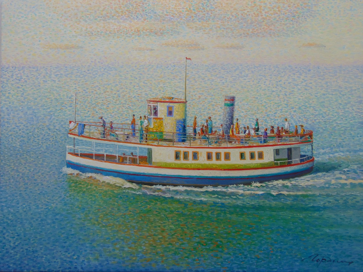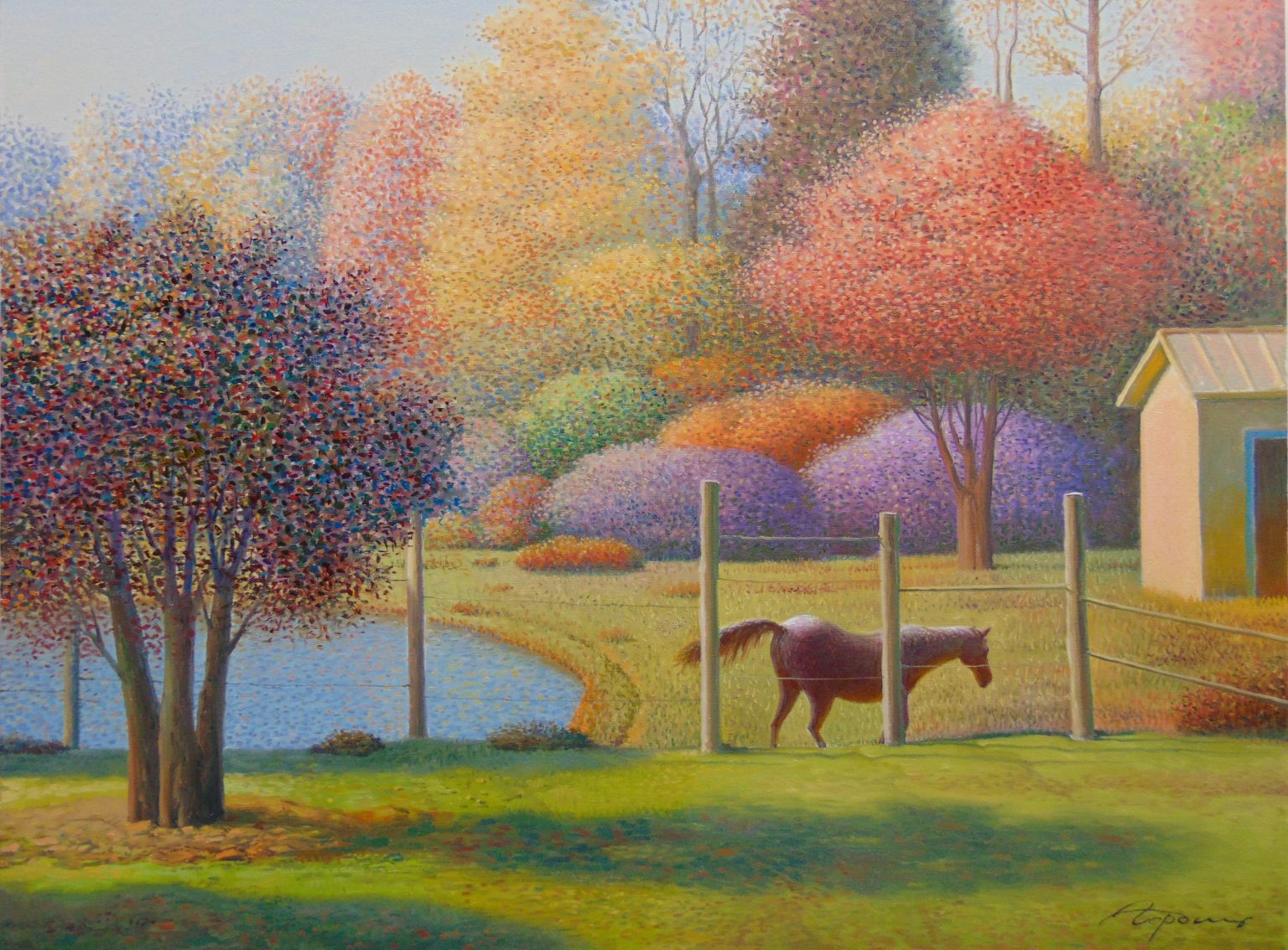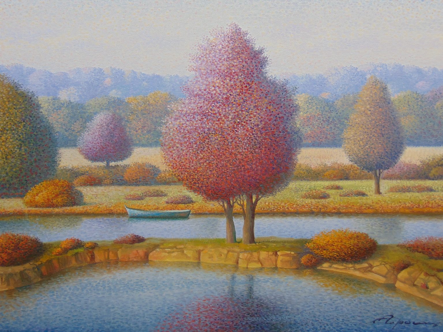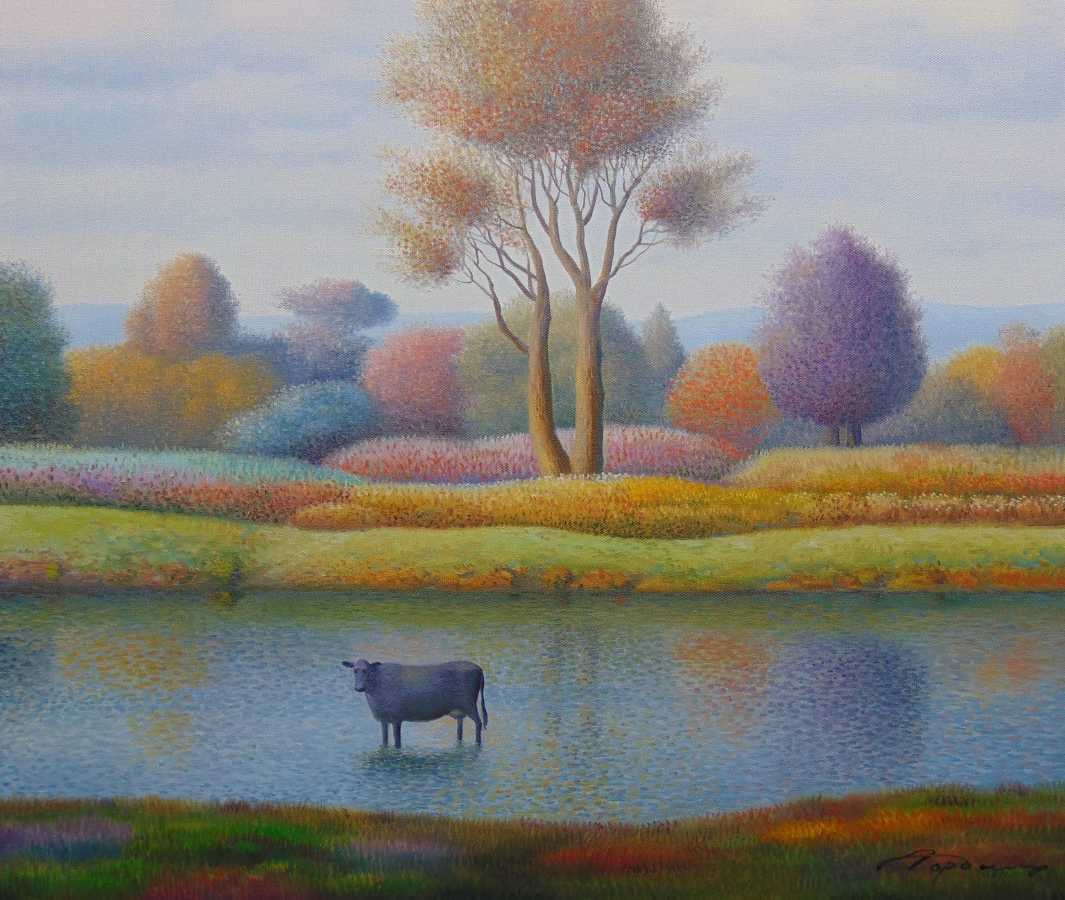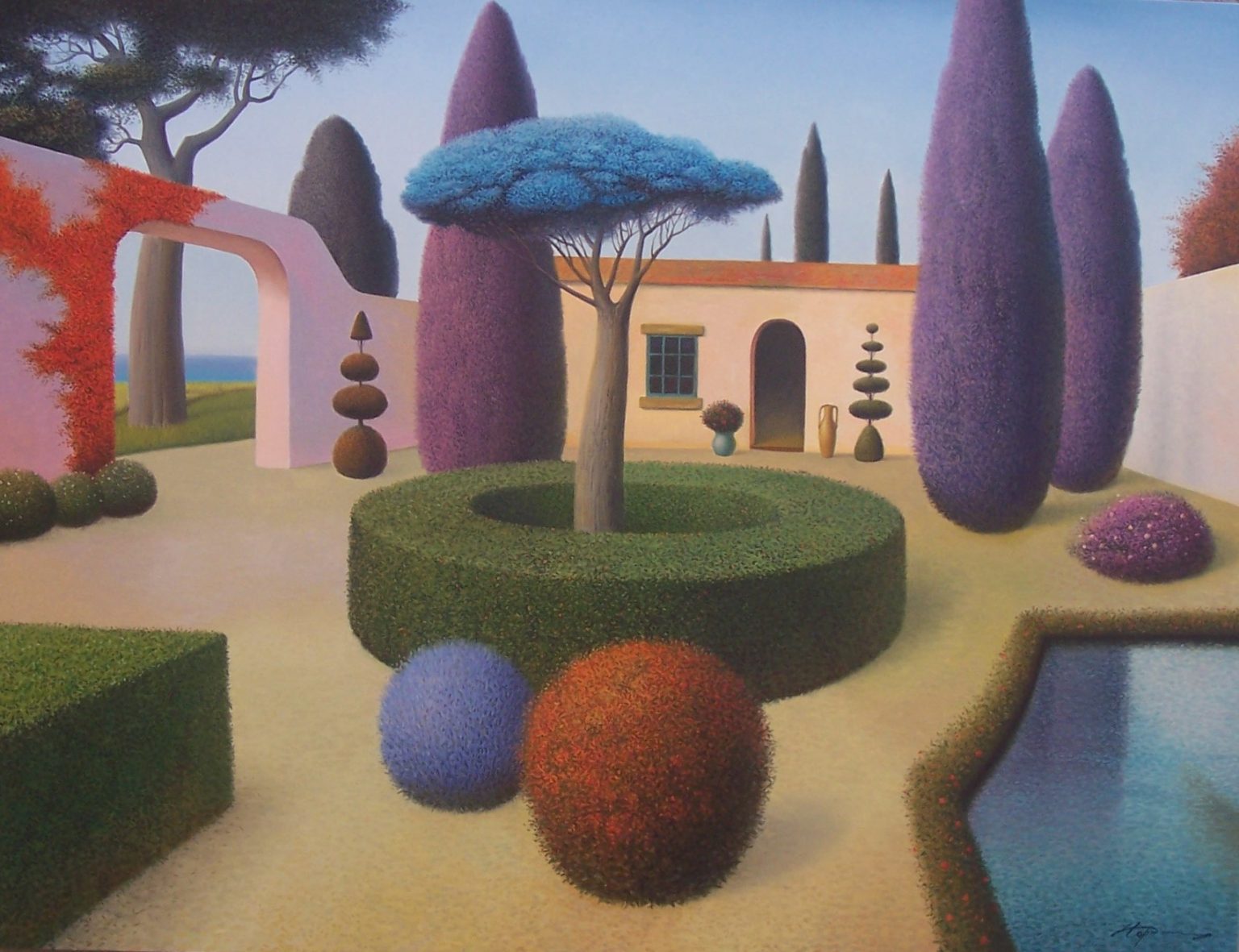 You’ll find below a quick selection from Evgeni’s website. I avoided the purely abstract ones, as well as the still life. I included a couple of pointillistic ones, and even from this sample, I guess one can notice the recurrent themes: Mediterranean-like landscapes, shapes of women in the rocks, peacocks, apples, fish, and the very specific way of representing the trees, the women, the houses. Now you tell me which painters have influenced пан Гордієць (or is it пана Гордієця?).