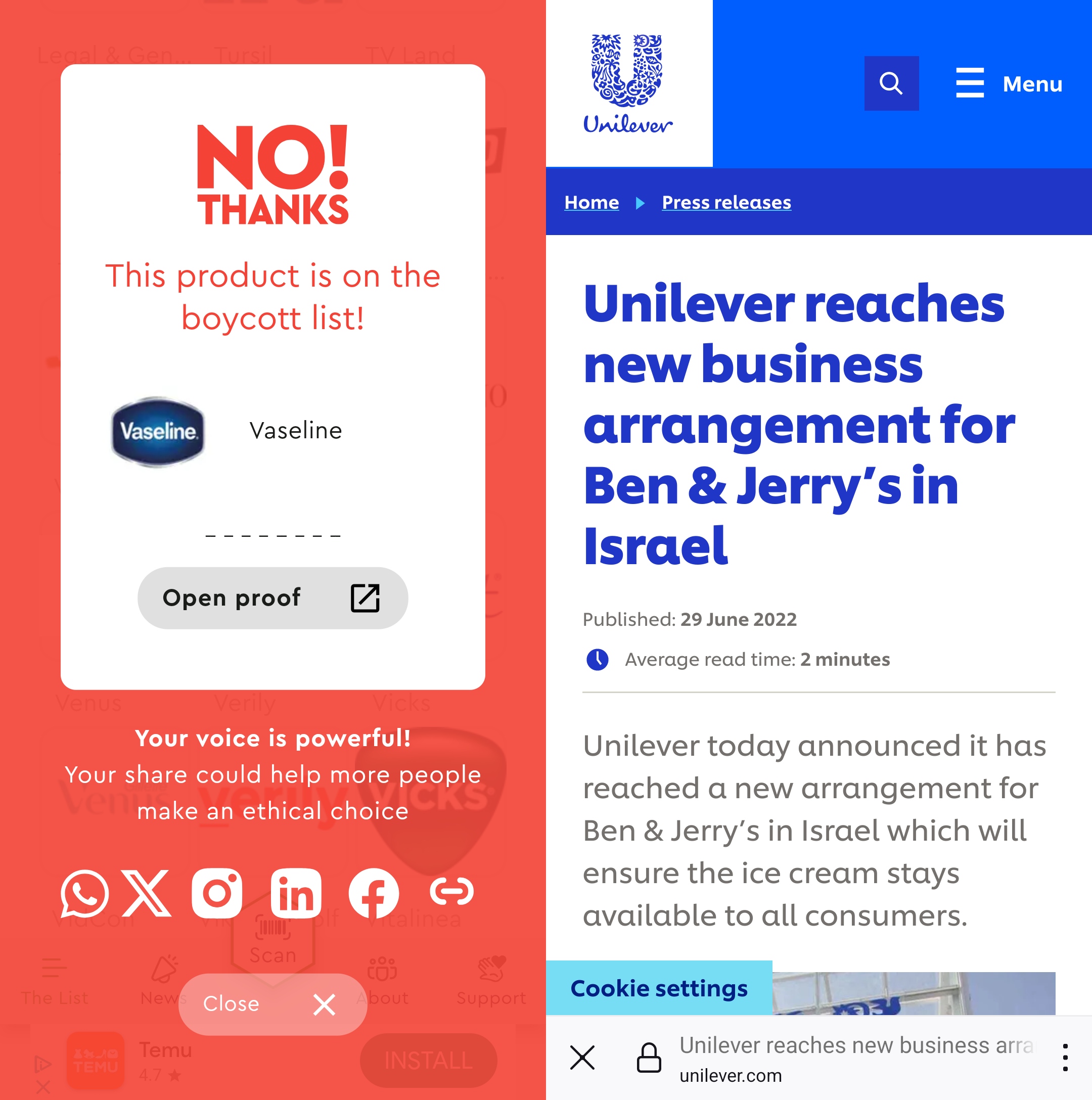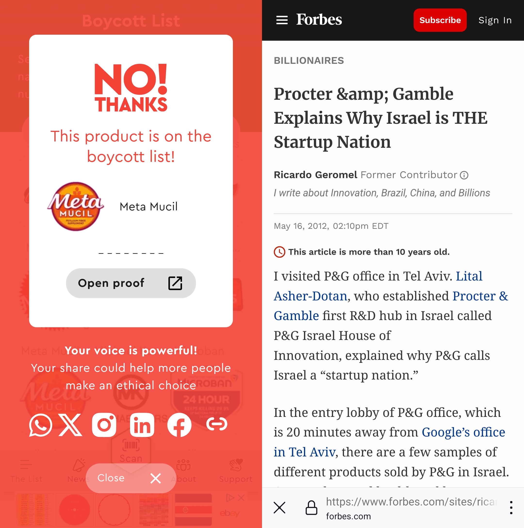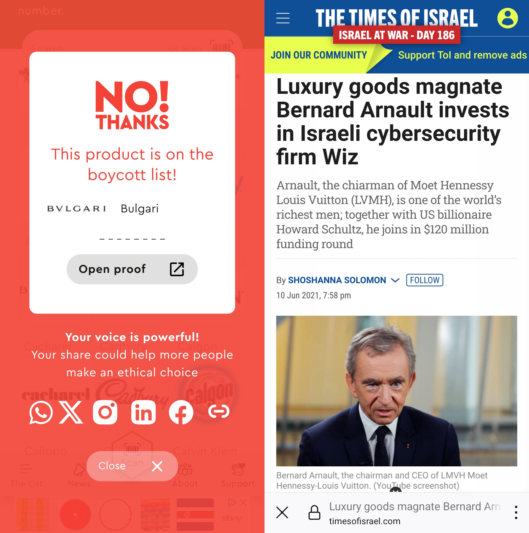 For instance, Meta Mucil is to be boycotted because Procter & Gamble has established an office in Tel Aviv, “20 minutes away from Google’s office,” and because P&G considers Israel to be “THE startup nation.” Bulgari is to be boycotted because Bernard Arnault has invested in an Israeli cybersecurity firm. And you shouldn’t use Vaseline because Unilever made sure their ice cream range is available in Israel!