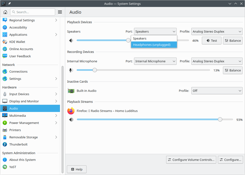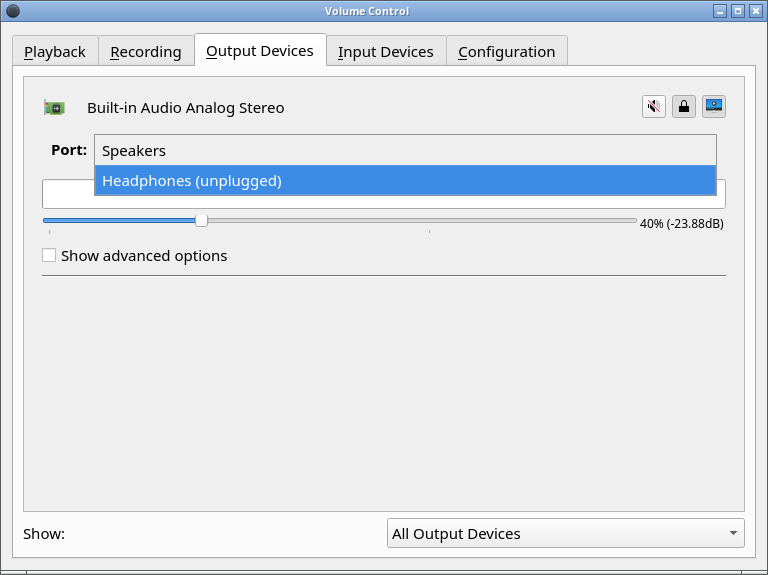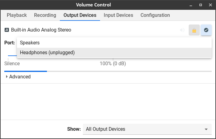 I used to live with that because, just like I noticed in 2020, when I was using XFCE, it was still possible to manually select the “Headphones (unplugged)” output device in pavucontrol (PulseAudio Volume Control), and the sound would go through, even if the system didn’t detect that the headphones jack had been inserted.