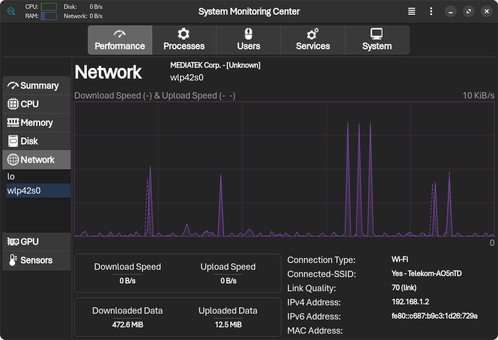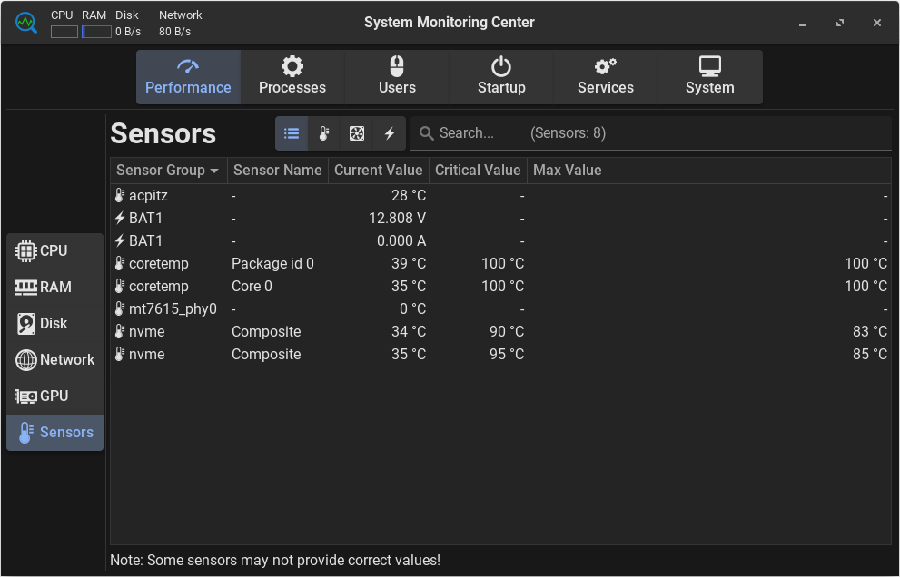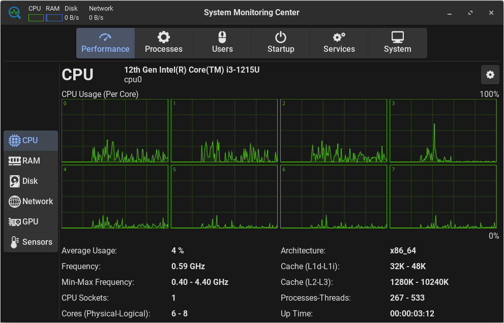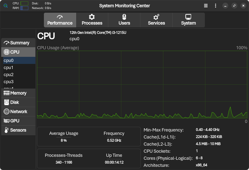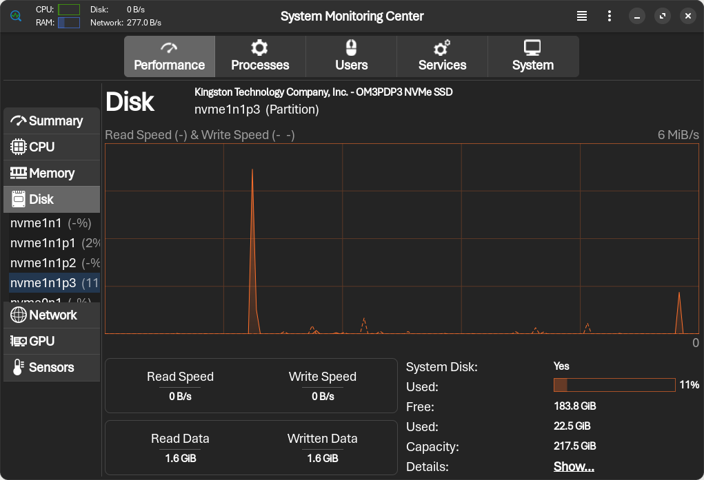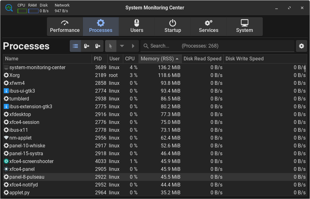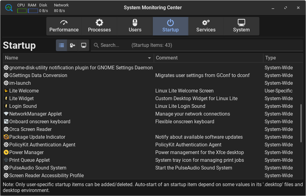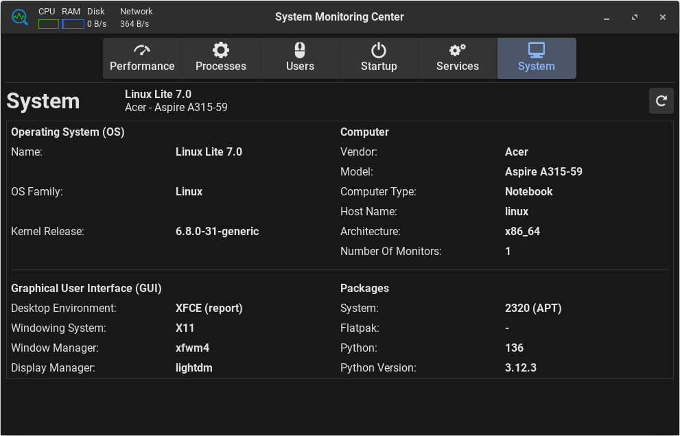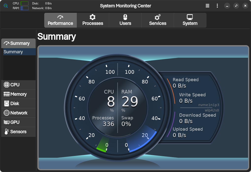 Linux Lite has a very nice System Monitoring Center, which is a fork of Hakan Dündar’s homonymous tool, which has been abandoned, unfortunately: