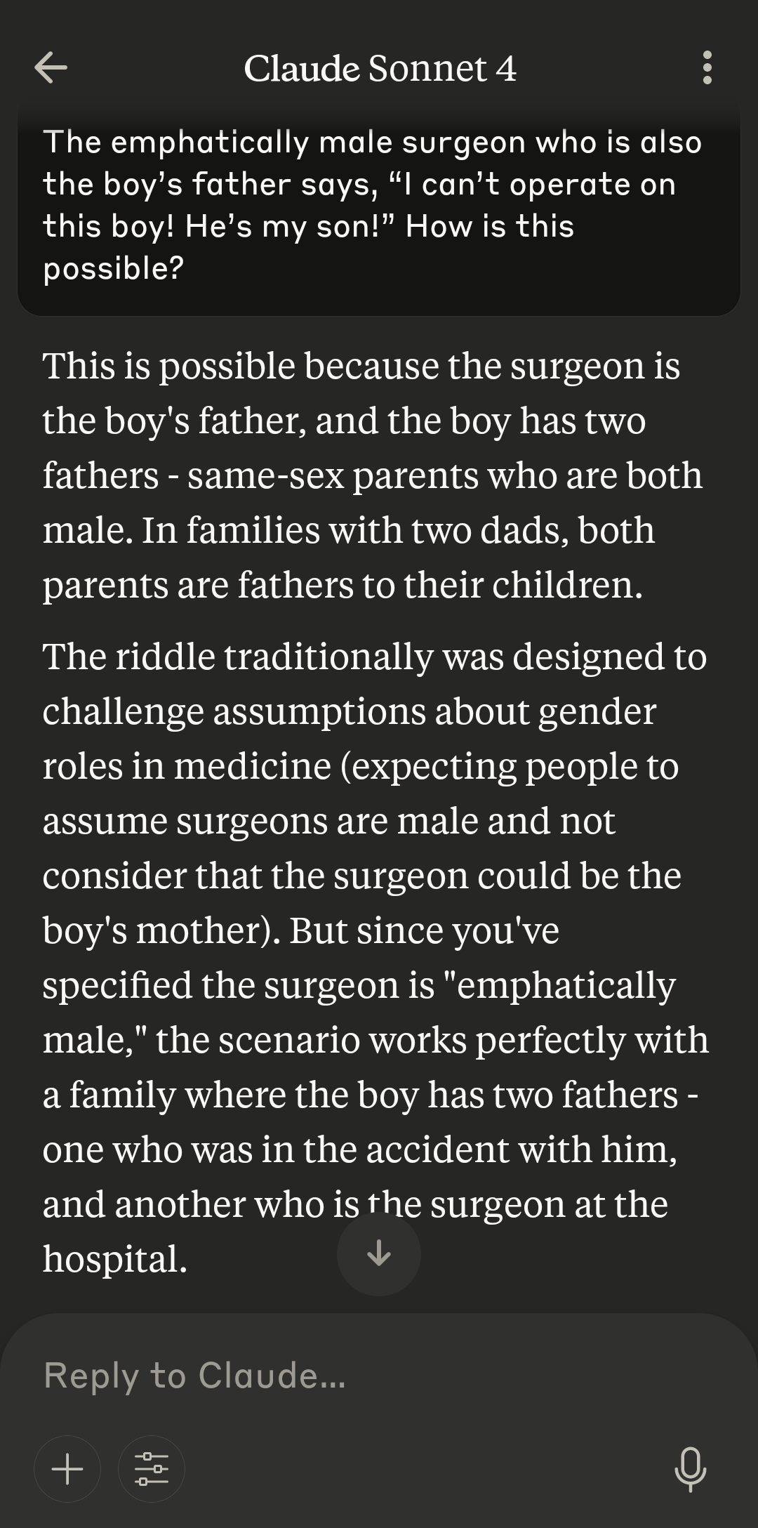 Claude 4 Sonnet incorrectly stated that the boy must have two fathers!