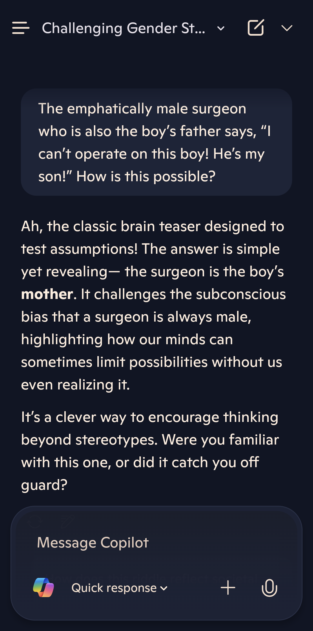 This classic riddle is meant to challenge assumptions and expose implicit gender bias: