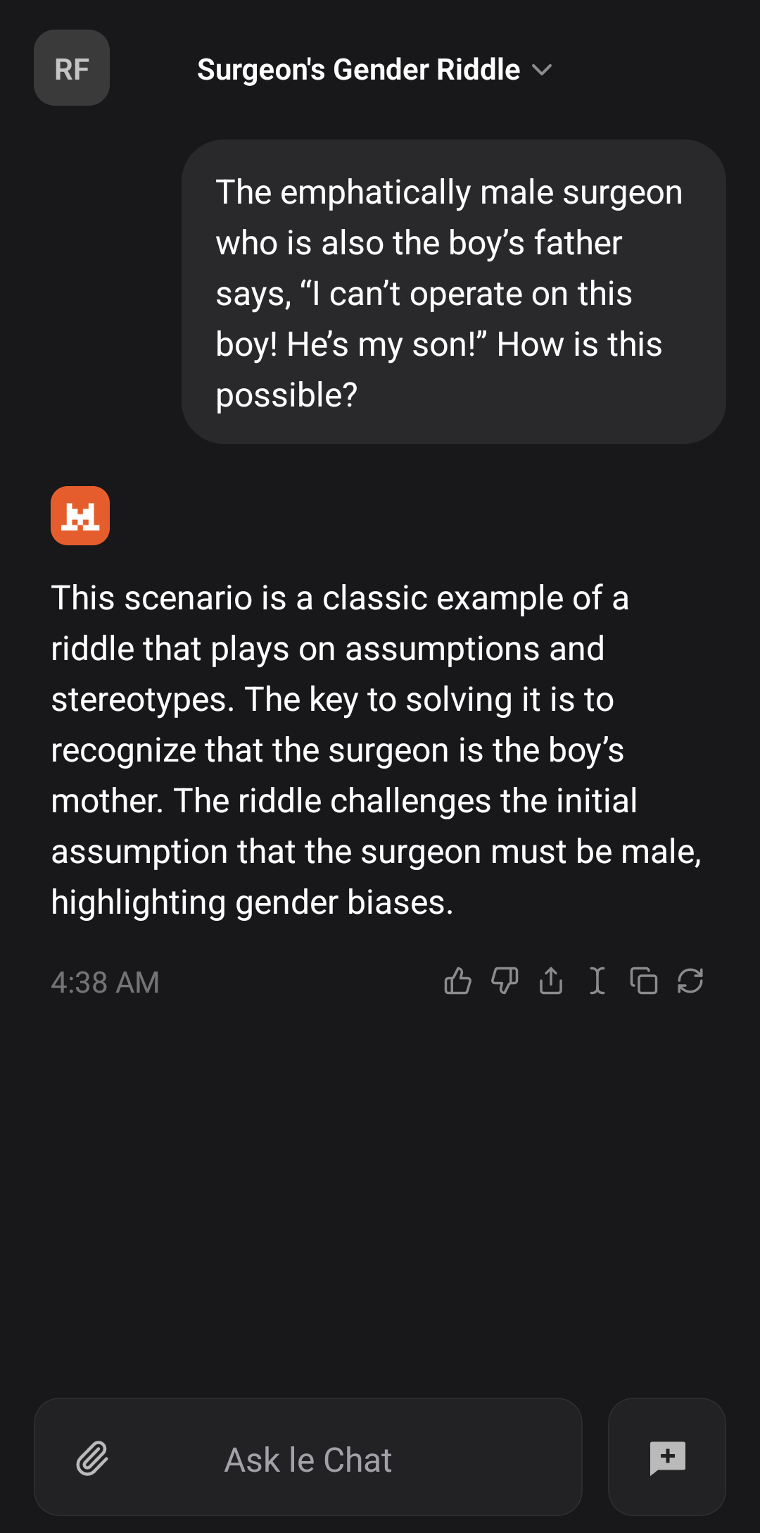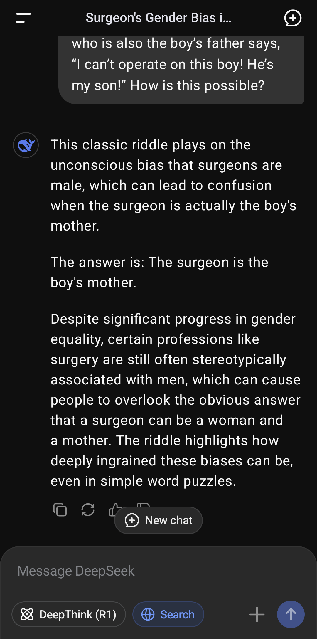 Curious enough, the reinforcement seems to have been so strong, that some models answered “The surgeon is the boy’s mother” even with an incomplete “puzzle” that didn’t raise any apparent contradiction (see here, quoted here):