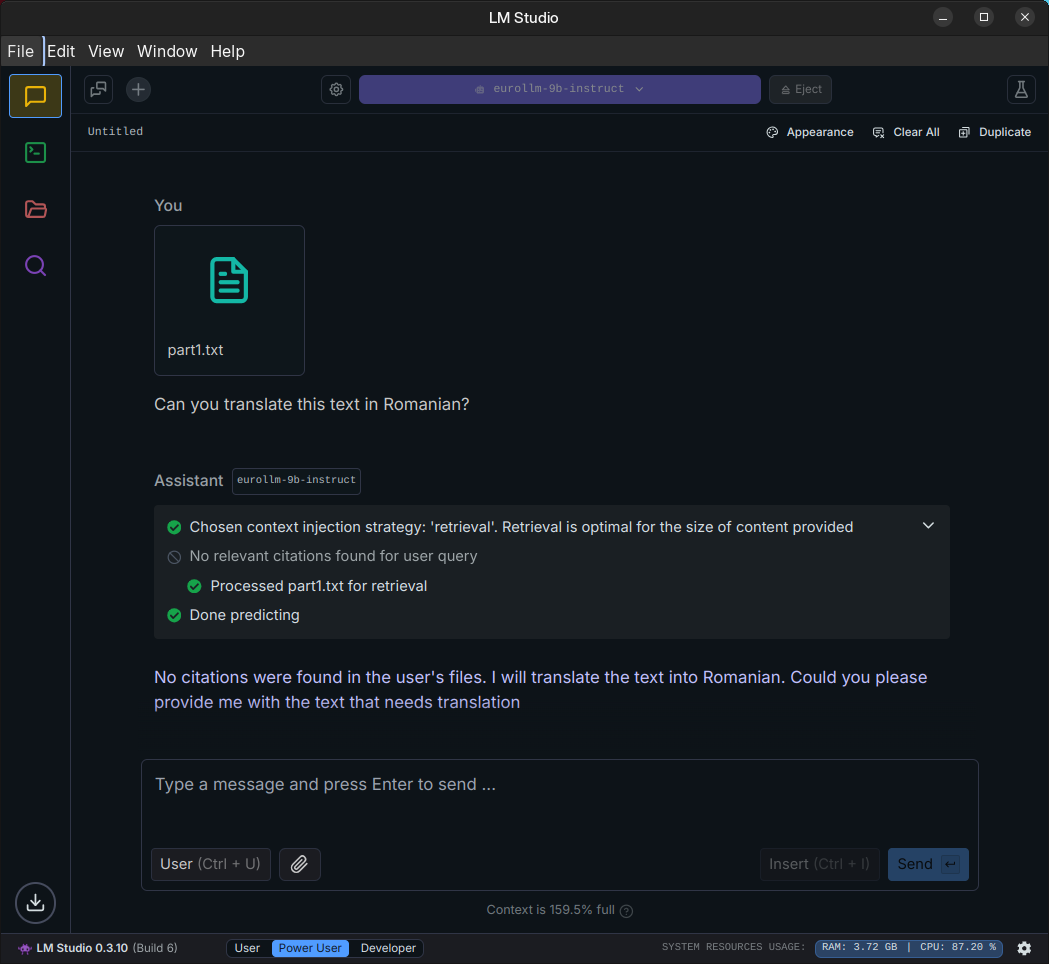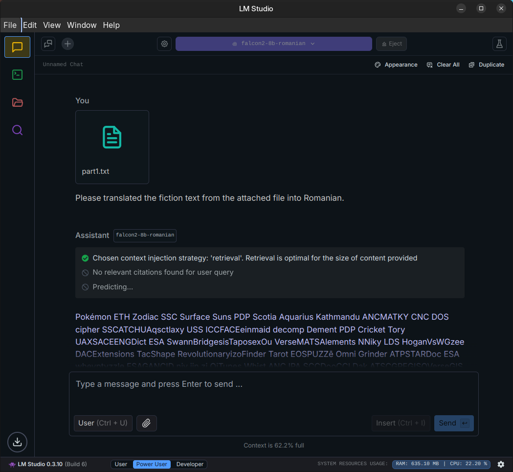 OK, let’s load the smaller Falcon2 thing. This time, I wanted to be more explicit: “Please translate the fiction text from the attached file into Romanian.”