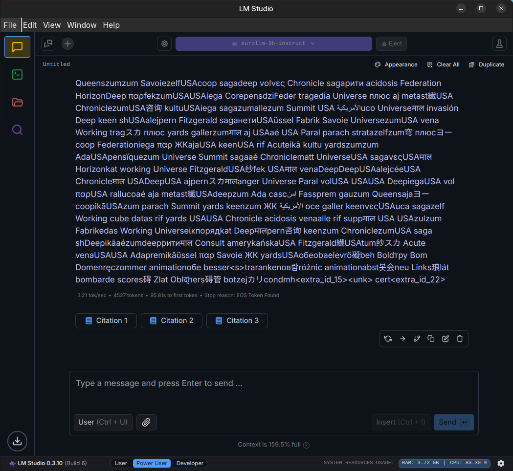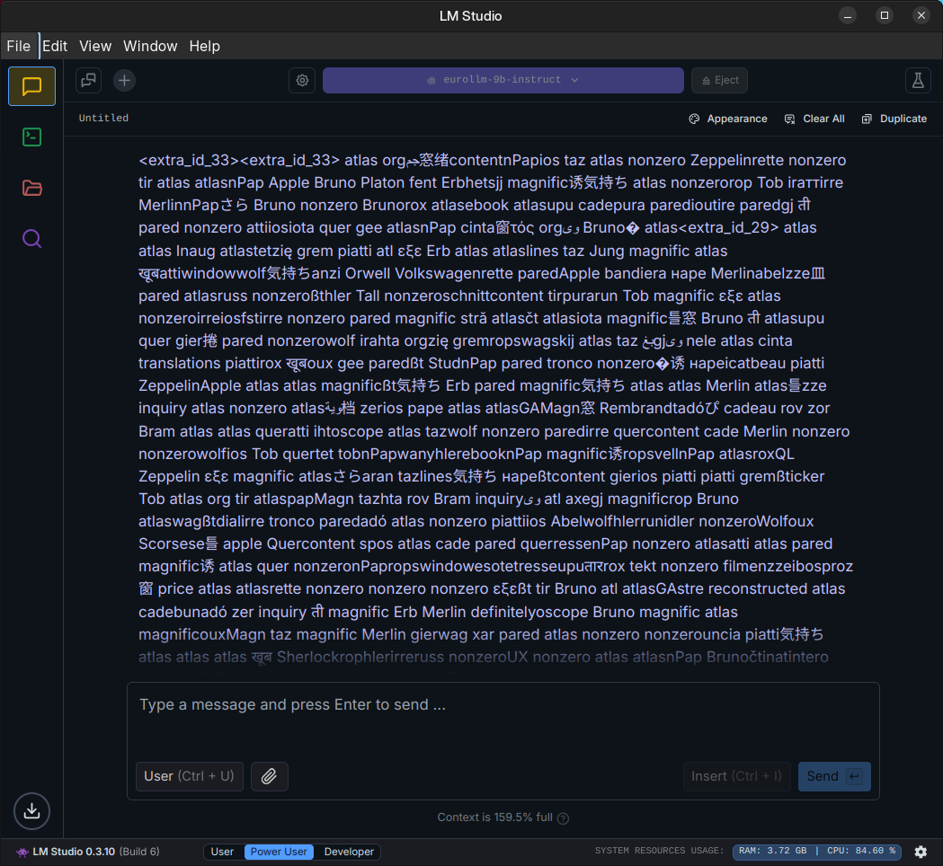 As for EuroLLM (7.51 GB), it’s not necessarily too small for a multi-language model. It’s a 9B model, quantized to 6 bits (Q6_K). But it’s not meant for fiction: “Fine-tuned on ~30 European languages, with heavy EU translation corpora.” That means legal, governmental, policy, news, reports, and essays. It might sound robotic for fiction, and it might lack the understanding of colloquial language, slang, and metaphors.