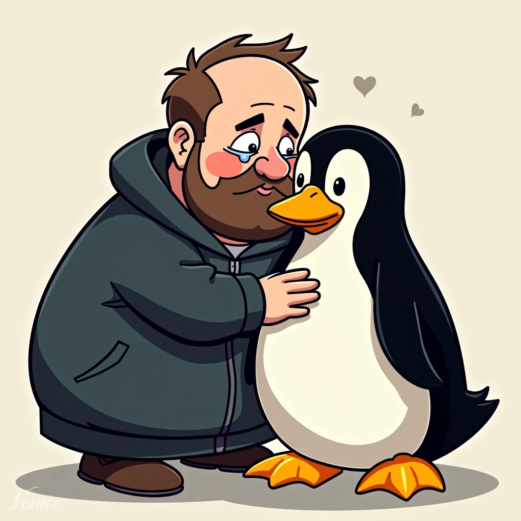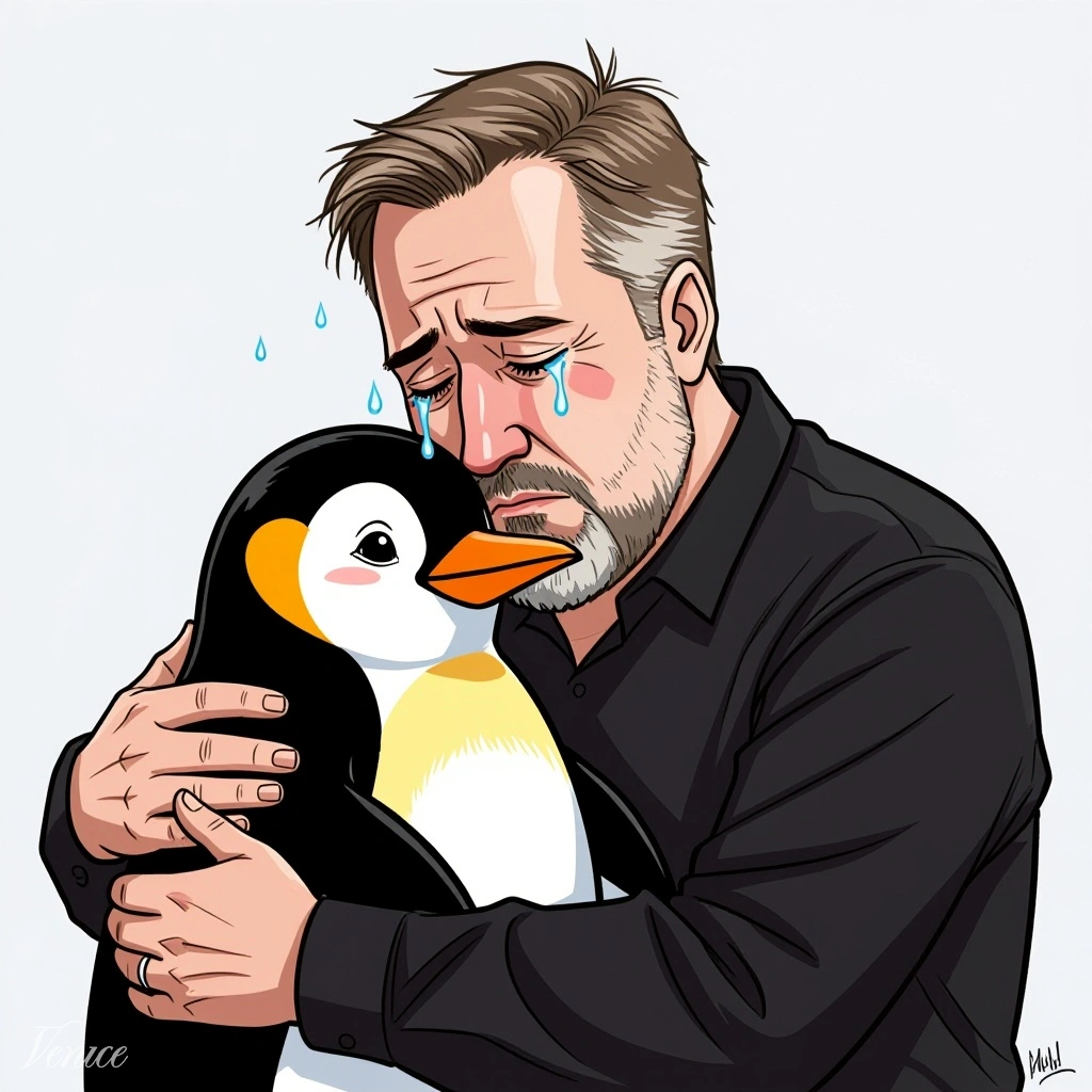 Draw me (in landscape mode) Linus Torvalds in tears, embracing Tux the penguin.