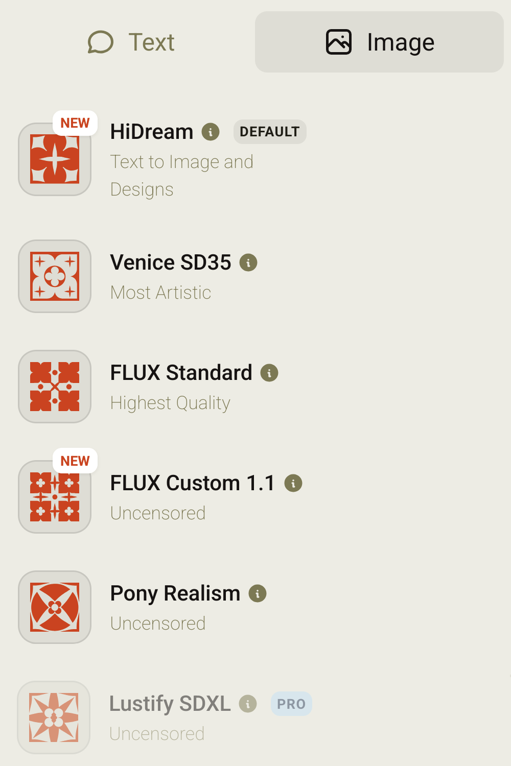 - FLUX Custom 1.1 Uncensored (getphat-flux-reality-nsfw): “an uncensored, LoRA-modified version of FLUX, which removes much of the censorship that was inherent in the underlying model. While this enables NSFW image generation, note that the “Safe Venice” setting still blocks NSFW unless you turn this setting off. There is a LoRA Strength slider in the options for this model. The lowest setting means it should act nearly identically to the normal FLUX model, and the highest setting is the most uncensored (but sometimes causes quality issues).” This model is not in public access!