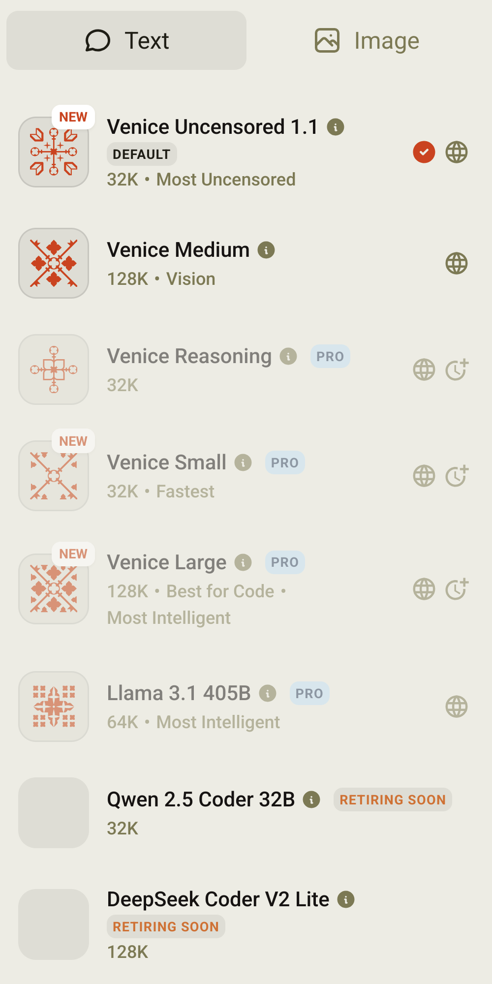 - Venice Small (Qwen3-4B), 32K context window. “The latest 4-billion-parameter model in the Qwen series, featuring a unique “thinking mode” for complex reasoning (math, coding) and a “non-thinking mode” for efficient general dialogue. It offers enhanced reasoning, strong agent capabilities, and multilingual support for over 100 languages.” Yeah, it’s Qwen3, but the smallest of it, with a paltry 4B parameters! Why would anyone pay for such a tiny thing that could be run locally?