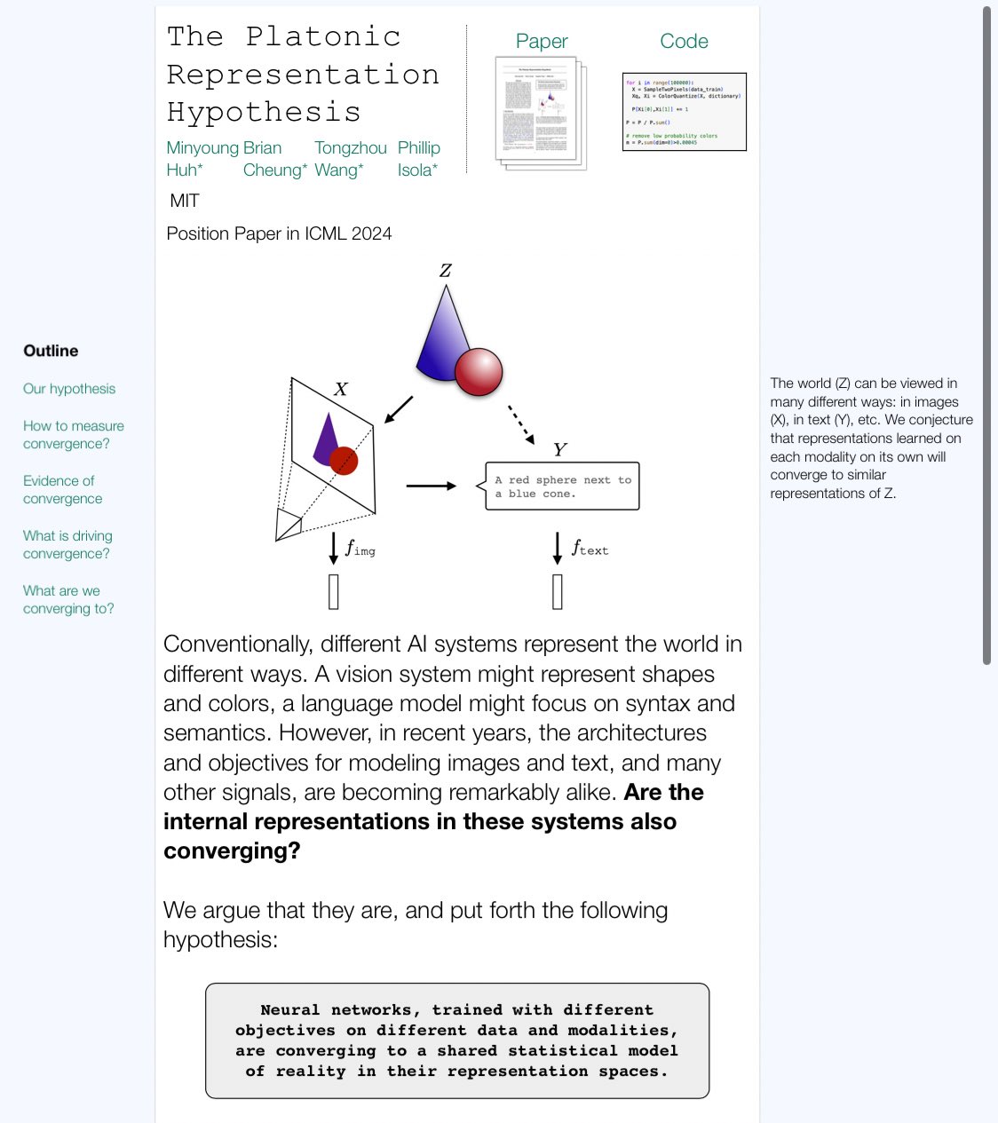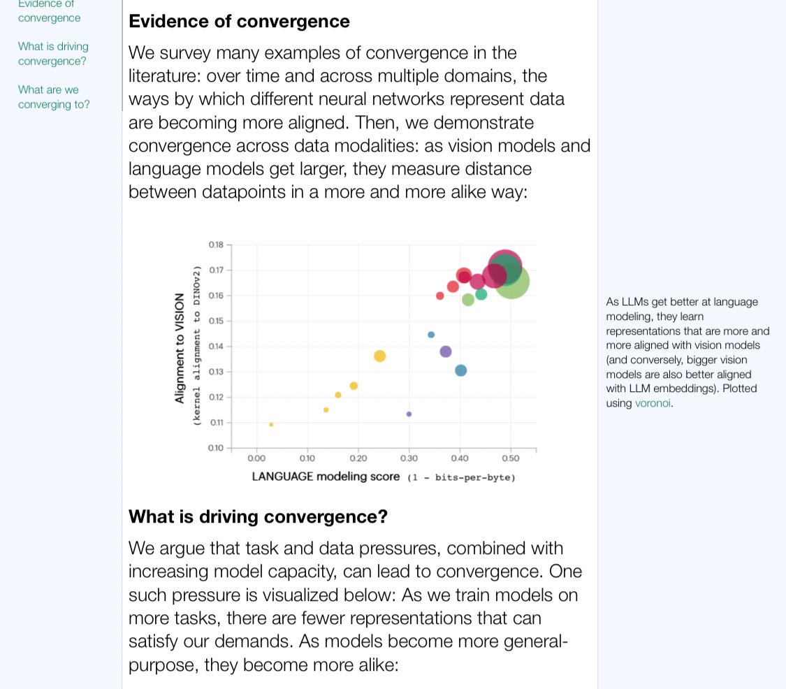 They focus on representations that are vector embeddings and show that different models and then even modalities converge using their metric. They talk in detail about quite interesting multi-modal technicalities, only steering to philosophy towards end.
