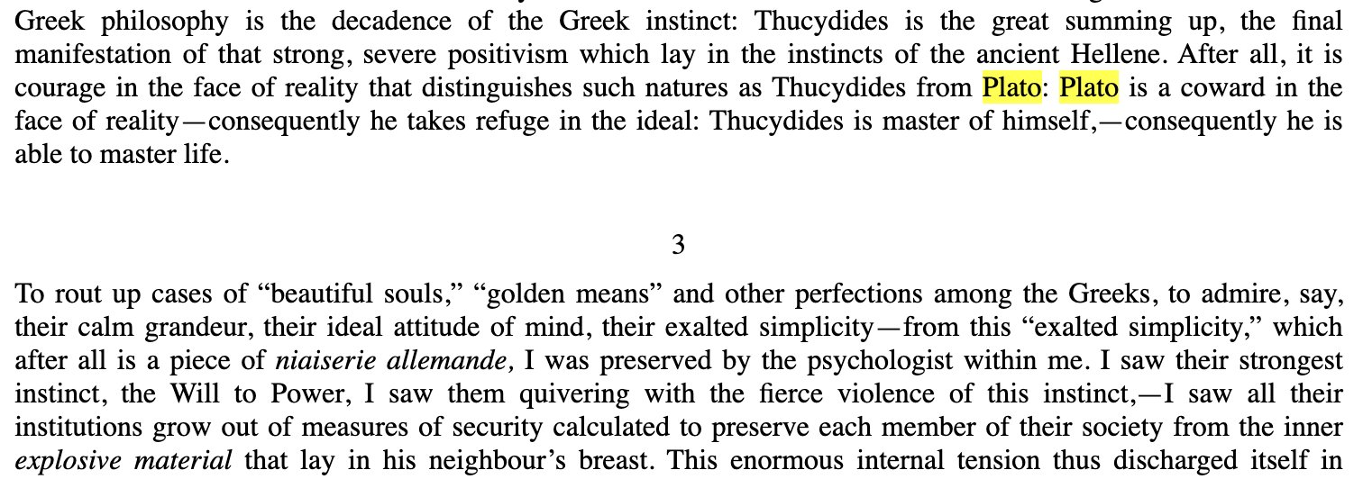 He accuses Plato of creating an “ideal realm” to compensate for the death of Greek warrior instinct.