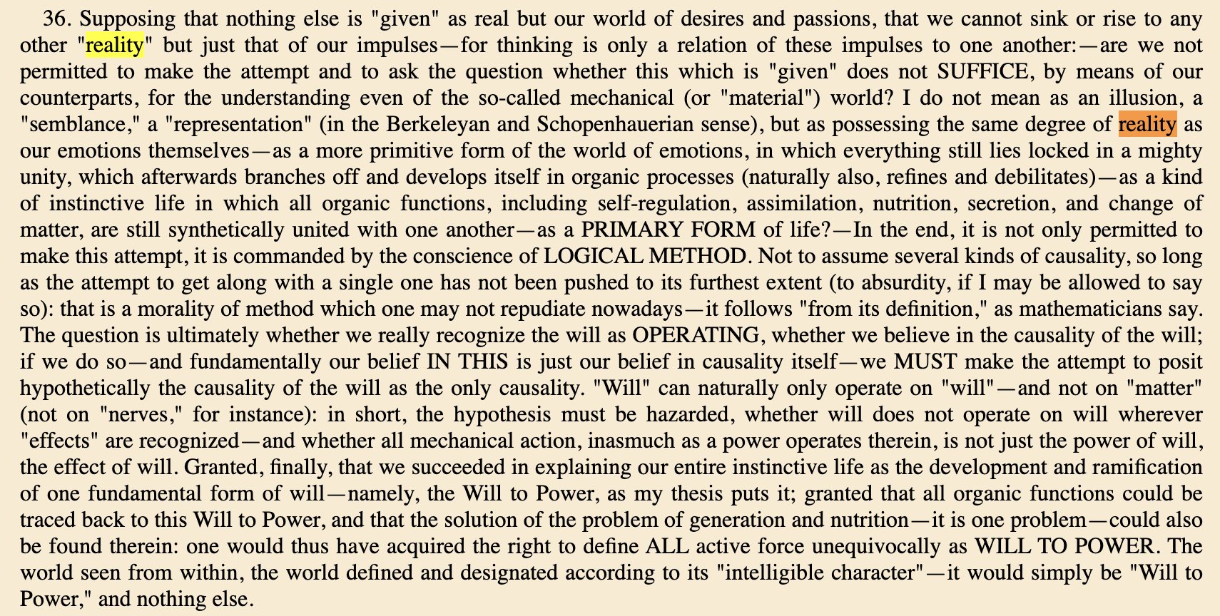 Famous passage from BG&E where suggest all of reality is the subjective Will to Power – He has a specific quip where he says reality may be a giant subjective vortex, but I can’t find it.