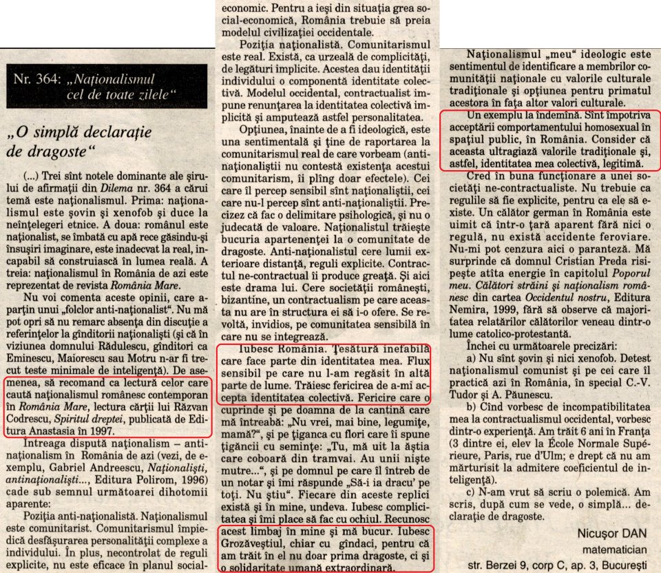 Trei sînt notele dominante ale șirului de afirmații din Dilema nr. 364 a cărui temă este naționalismul. Prima: naționalismul este șovin și xenofob și duce la neînțelegeri etnice. A doua: românul este naționalist, se îmbată cu apă rece găsindu-și însușiri imaginare, este inadecvat la real, incapabil să construiască în lumea reală. A treia: naționalismul în România de azi este reprezentat de revista România Mare.