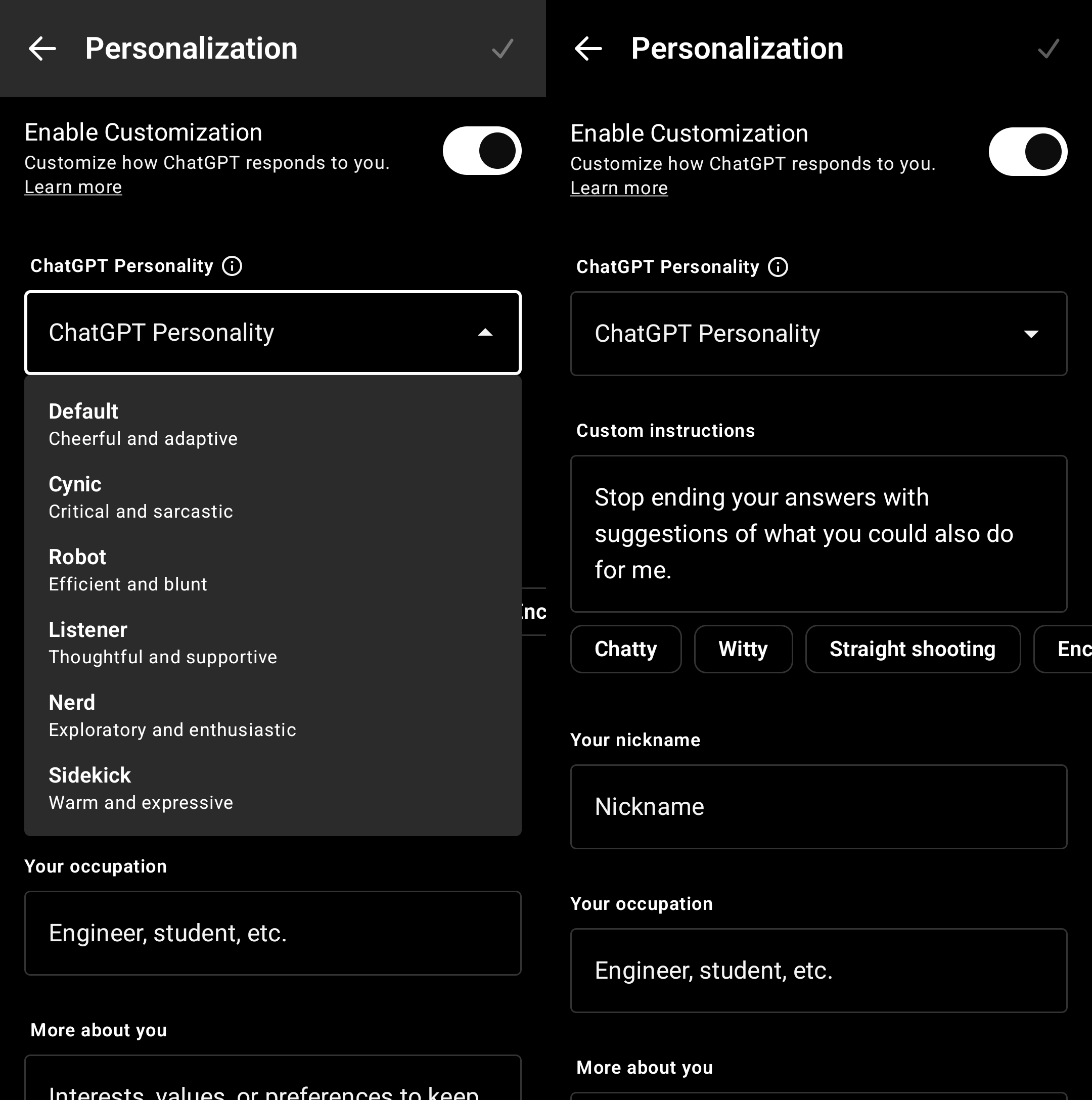 I didn’t want to change its personality (all of them seem stupid), but I added a custom instruction: