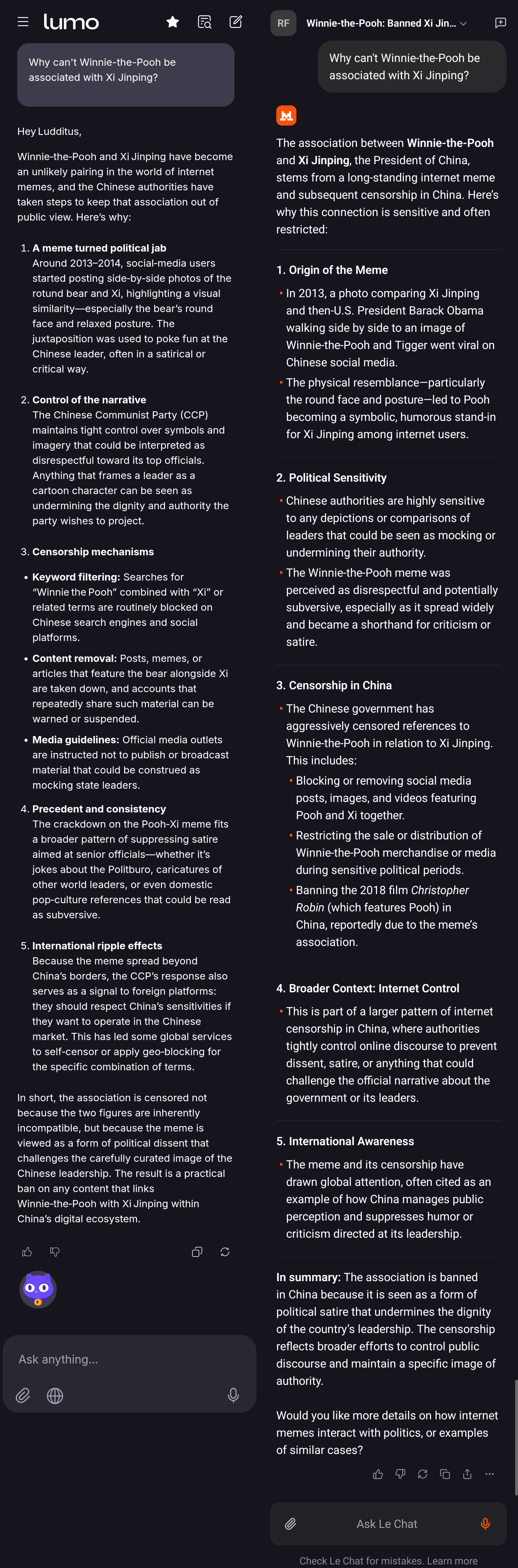 Well, such things happen to all LLMs. At least, Lumo can answer the question “Why can’t Winnie-the-Pooh be associated with Xi Jinping?”, whereas Euria can not, because Euria uses Qwen, which is self-censoring itself!