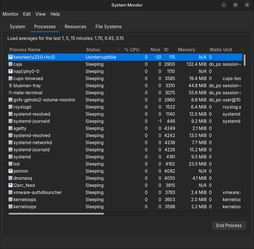 mate-system-monitor, the “Uninterruptible” label confirms this: the process is stuck in a kernel wait queue.- Even
