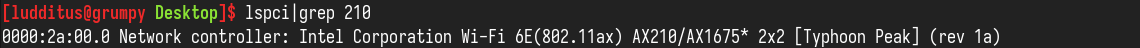 0000:2a:00.0 Network controller: Intel Corporation Wi-Fi 6E(802.11ax) AX210/AX1675* 2x2 [Typhoon Peak] (rev 1a)