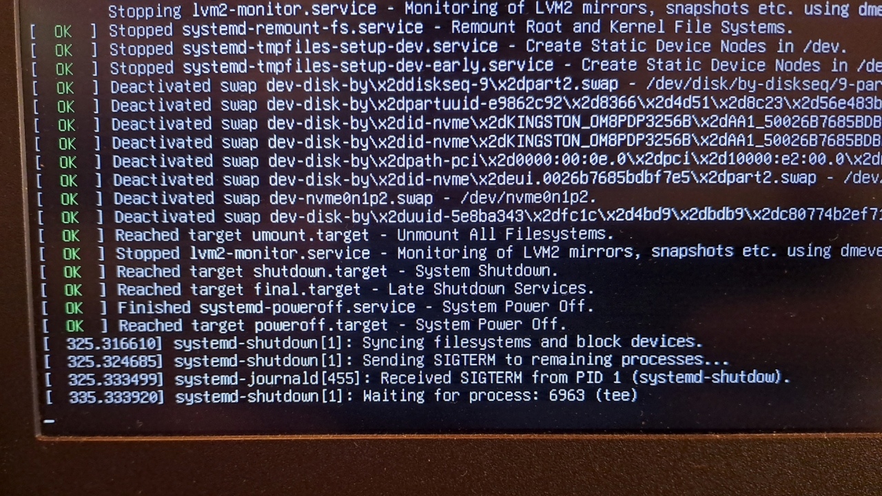 Dstate, it never exits, andsystemdkeeps waiting—hence the escalating timeout messages (1m30s, 3m…).- Eventually, you have to force a power off.