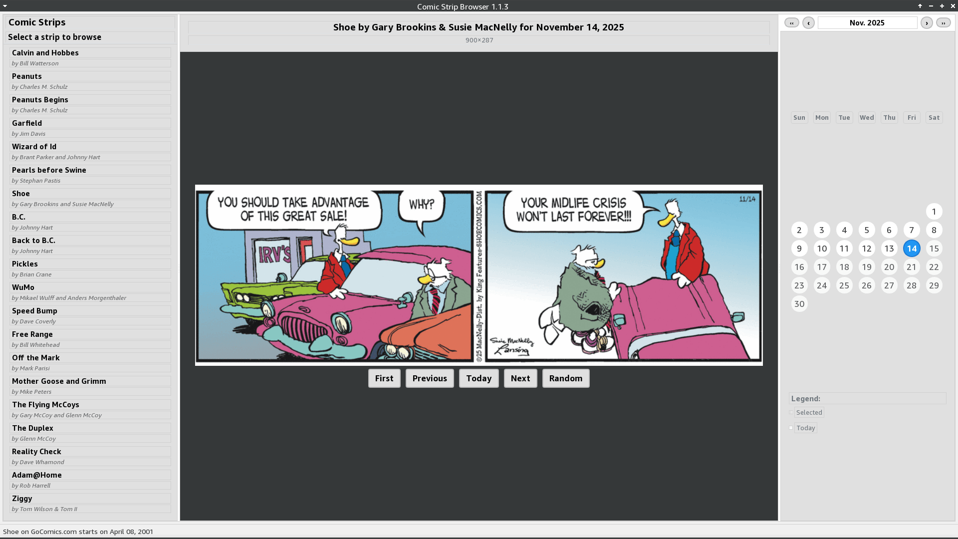 I released two new versions of my Comic Strip Browser one after another the same day. That’s because 1.1.2 added 6 new strips, but 1.1.3 had to remove an older one, so in the end there are 20 comic strip titles in the last version.