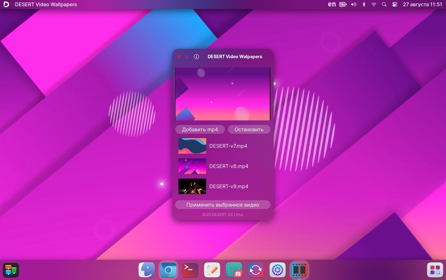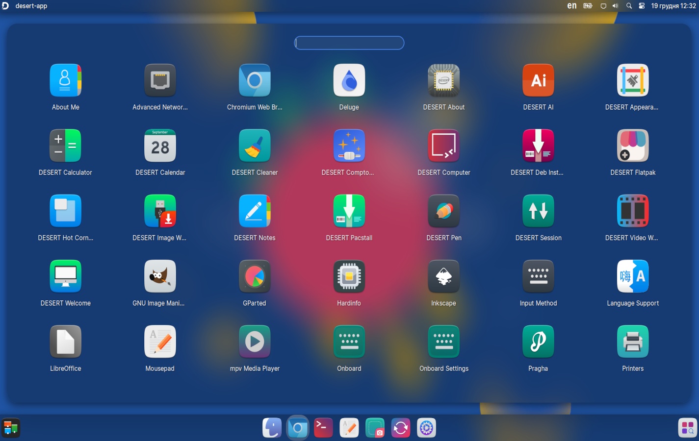 The preinstalled apps include Chromium, Deluge, DESERT FlatHub Store (which cannot be maximized and mixes EN and RU), DESERT Cleaner, DESERT Notes, DESERT Pacstall (it cannot be maximized), Synaptic, DESERT Video Wallpapers (why?), GIMP, Inkscape, Image Viewer (Ristretto), Libre Office, Document Viewer (Atril), Pragha Music Player, Redhshift, VLC Player.