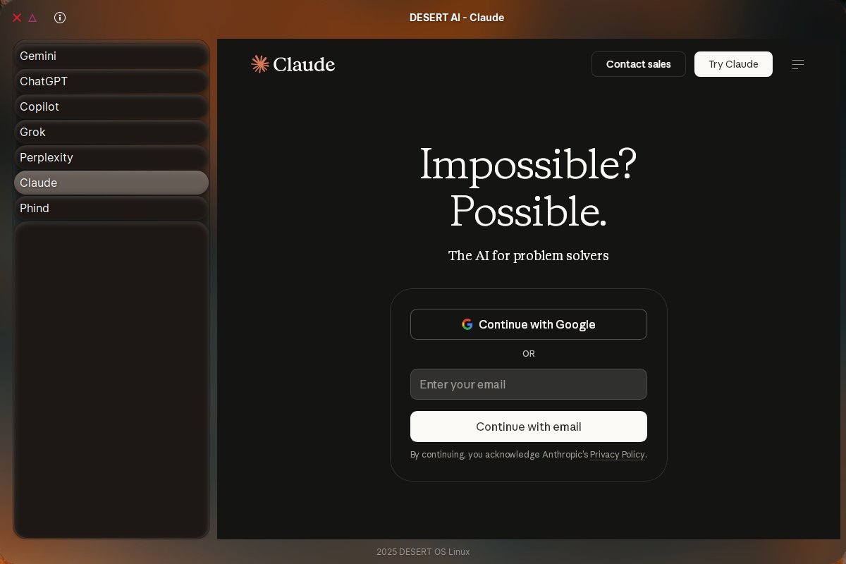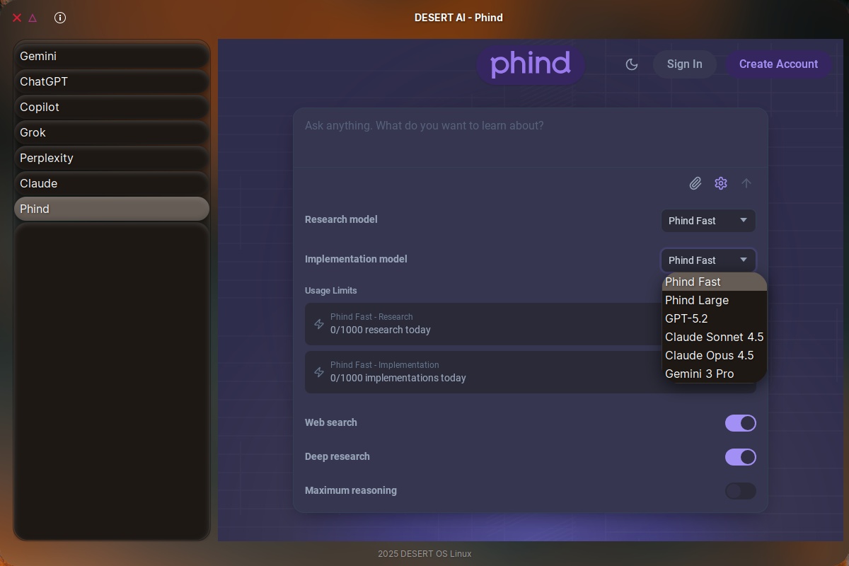 DESERT AI is a nice wrapper around several chatbots in their web app versions: Gemini, ChatGPT, Copilot, Grok, Perplexity, Claude and… Phind?! There isn’t much information about Phind (nothing to do with these fraudsters!), but they themselves seem unhappy with their models Phind Fast and Phind Large, so they can also use GPT-5.2, Claude Sonnet 4.5, Claude Opus 4.5, Gemini 3 Pro. Not for free, I bet.