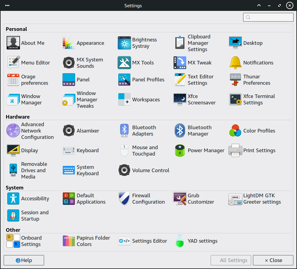 Let’s compare its (not bloated) XFCE System Settings with MX’s (and note that MX Tools opens another panel):