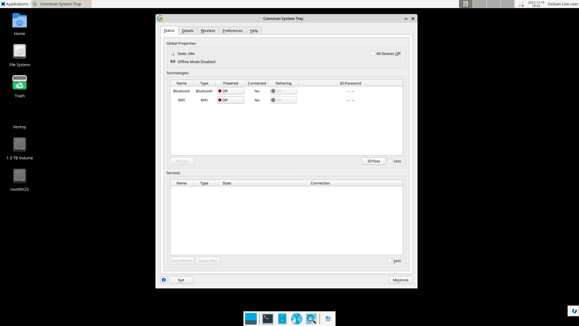As expected (iwlwifi complained in dmesg about the lack of a firmware), both Wi-Fi and BT were disabled (it’s a combo chip). Formally, Wi-Fi accepted to be enabled, but it didn’t work, so zero access points: