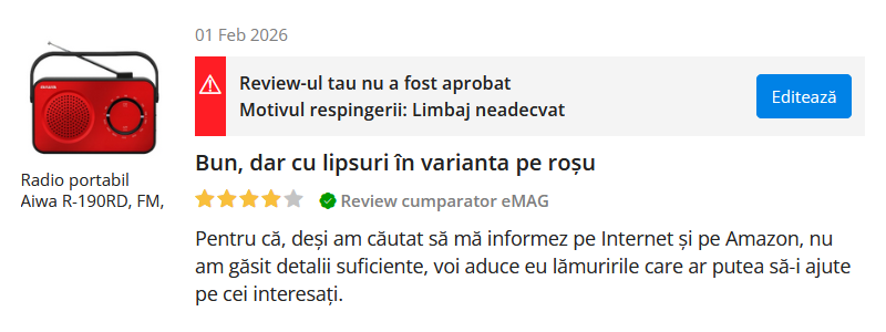 În acea vreme, în contul meu, scriptul ăla nenorocit precizase ceva de genul „nu se permite specificarea de prețuri”. Dar eu scrisesem doar că am găsit produsul pe eMag mai ieftin decât în alte părți, ceea ce ar fi fost în măsură să le crească vânzările! Nici un preț exact nu fusese menționat. În schimb, și astăzi dacă vă uitați pe recenziile de pe eMag, vezți găsi multe care menționează prețul exact de achiziție! Alea cum de nu încalcă nimic?