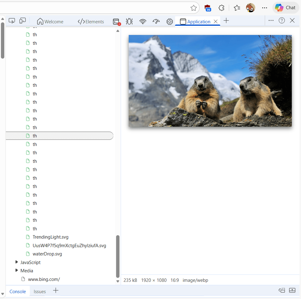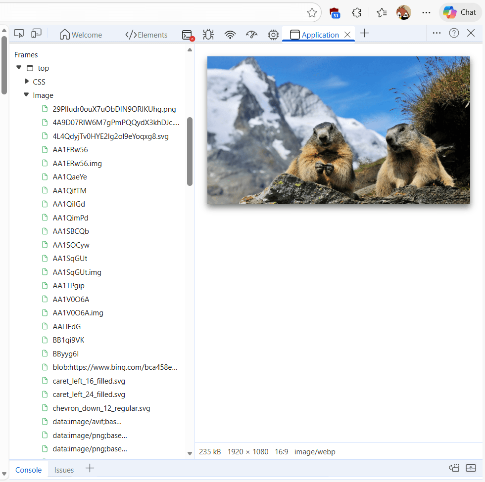 ❷ A feature for which I need a browser like Chromium/Chrome/Edge is an “inspector” that, under “Application,” displays “Frames” that can be expanded to list all images in the page, including those in the cache: