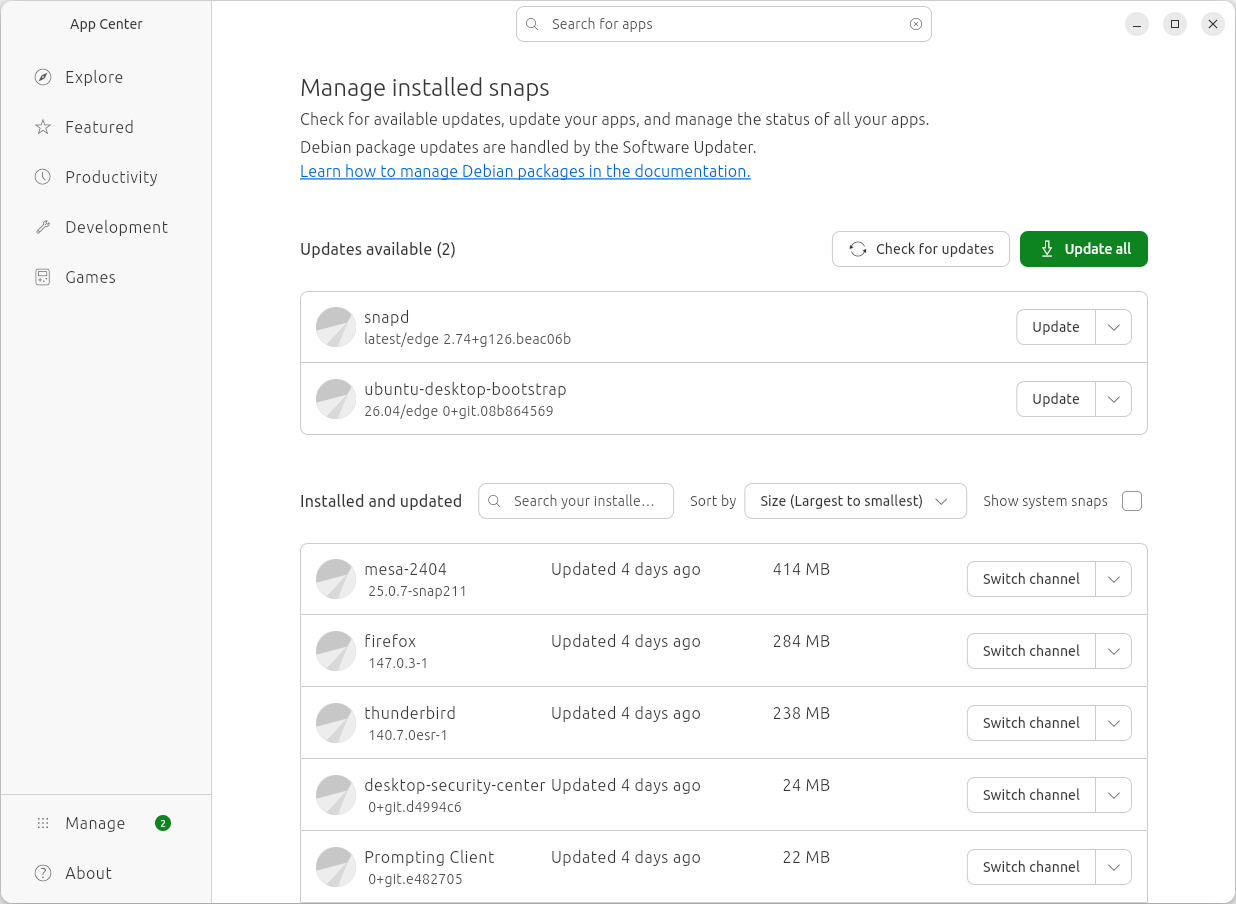 After all, Synaptic is also not installed by default, because it’s definitely “too complex”! Canonical’s sheeple are supposed to use the App Center, whose “Manage” section only manages snaps, including the ability to switch channels!