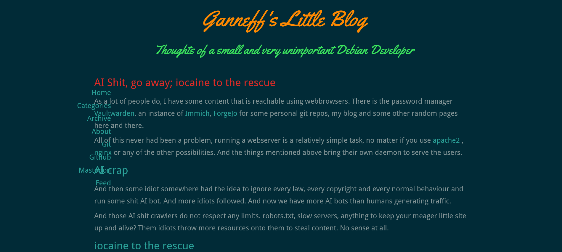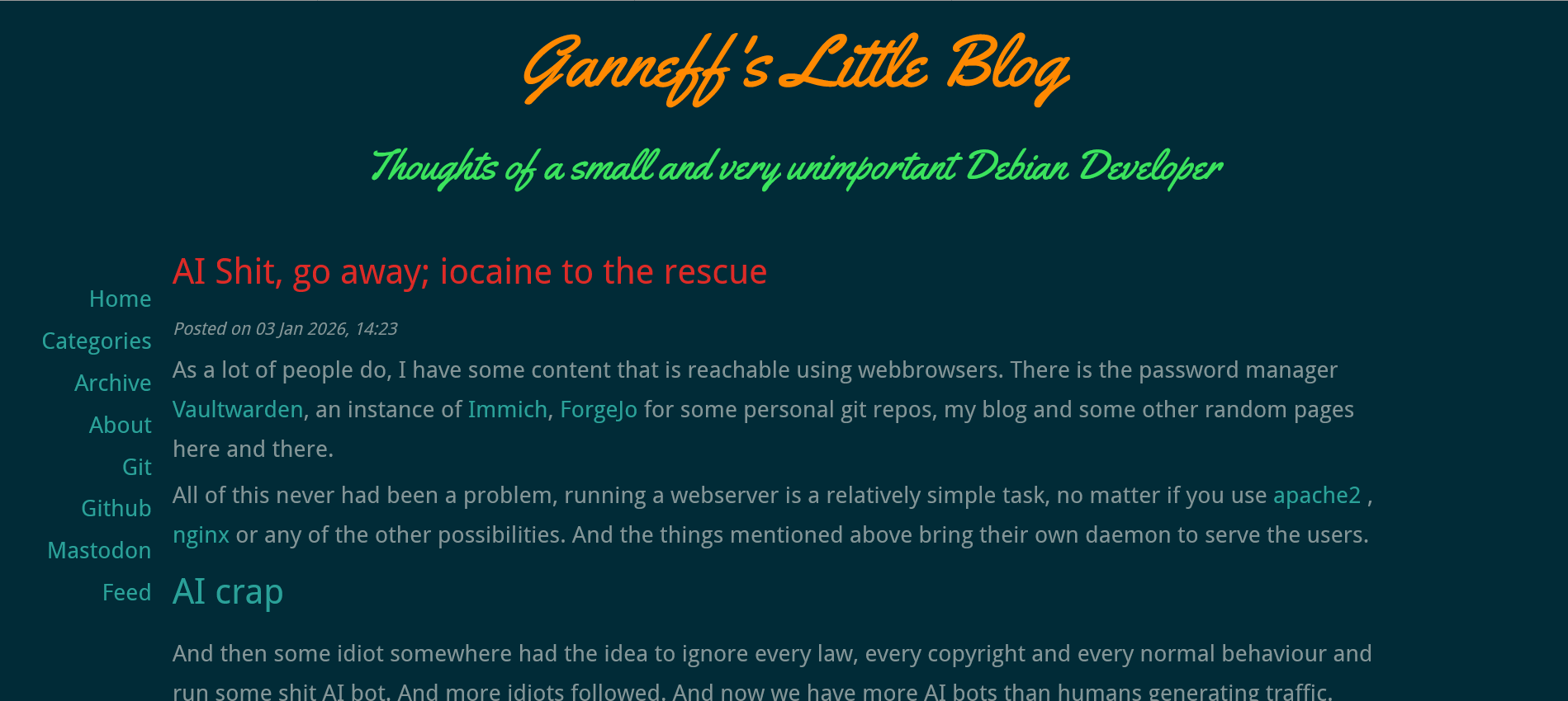 Take Jörg Jaspert, better known as Ganneff. On January 3, he posted on his blog, “AI Shit, go away; iocaine to the rescue.” His blog doesn’t display correctly on my 14″ laptop (125% scaling), regardless of the browser, unless I tell the browser to scale contents down to 80%. But the version archived by the Wayback Machine shows up just fine (see the 2nd screenshot below), despite displaying larger fonts!