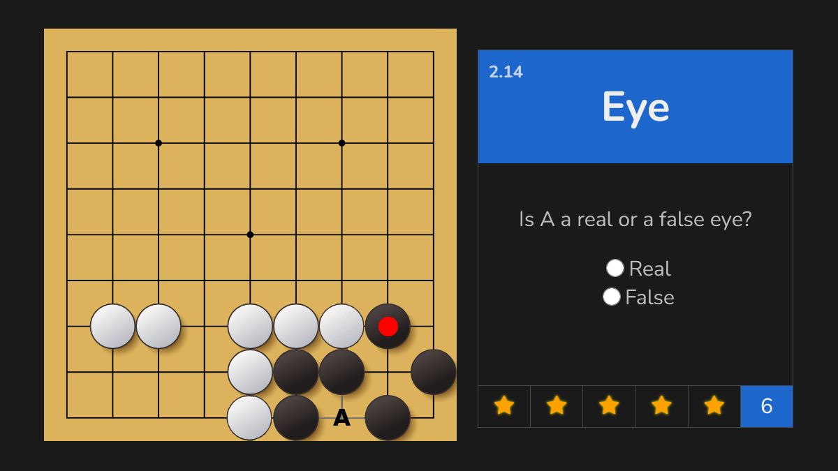 - If the Black stones are considered “cut” (because White holds the diagonal), it is a False Eye.
