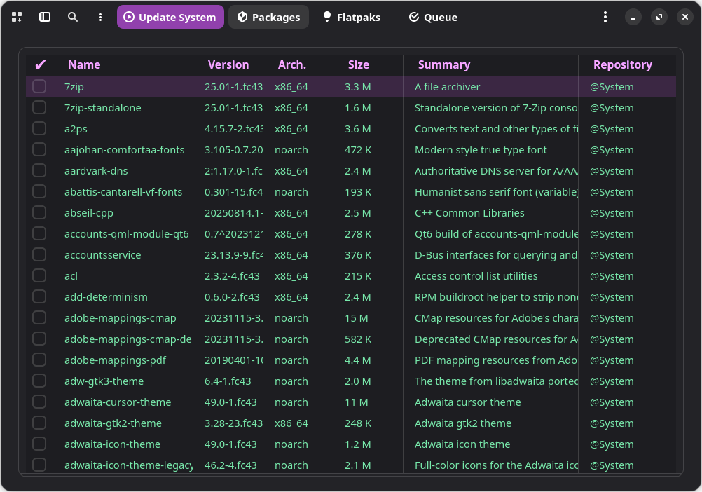 I tried Fedora 43 after it came out but I chose the Fedora Everything iso. I have come to do this with Fedora and its last couple versions for the last few times I’ve installed and tried it out. With Fedora 43 Everything, there is NO new installer. It still installed with Anaconda (which was fine by me). I have installed Fedora enough times I breeze through Anaconda quite fast including customizing my petitions. So I personally do not mind Anaconda at all. Plus the Everything ISO really allows the maximum software customizing in my opinion, regardless of desktop. Now, lastly one thing that keeps me from sticking with Fedora is that ever since Fedora 42, the program Dnfdragora behaves differently. Specifically, it requires wildcard (i.e. the * symbol) in the front or behind a package name if you don’t know the exact wording for a package but at least know some or most of just any of the keywords. It used to be I could just type “Libre” and it would list everything with those letters in its software name. If you do that since version 42, it will return no results. Thus you instead must type the wildcard * so Libre* will then list all the results. And the same for knowing the back half of the title and needing to put the * in the front of the partial or only word you know of the software for it to list it. Never before did you have to do this and Dnfdragora was and can be a great GUI for software, instead of Discover. So I just end up abandoning it and prefer openSUSE nowadays. And even openSUSE has the new Merlyn software GUI and it is just as good as YaST Software so that’s good of them to retain that user friendly element. Thank you and have a great day.