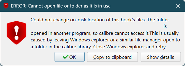 CORRECTION: Apparently, under Win11, Calibre raises this stupid error for the simple fact that I have the respective folder open in File Explorer. This does NOT lock the folder, which can still be deleted (other apps can do that). But even if it were so, the files themselves should be deletable, so in the worst-case scenario, Calibre should leave empty folders behind. Instead, this shit refuses to delete anything if the folder is open! THE FOLDER.