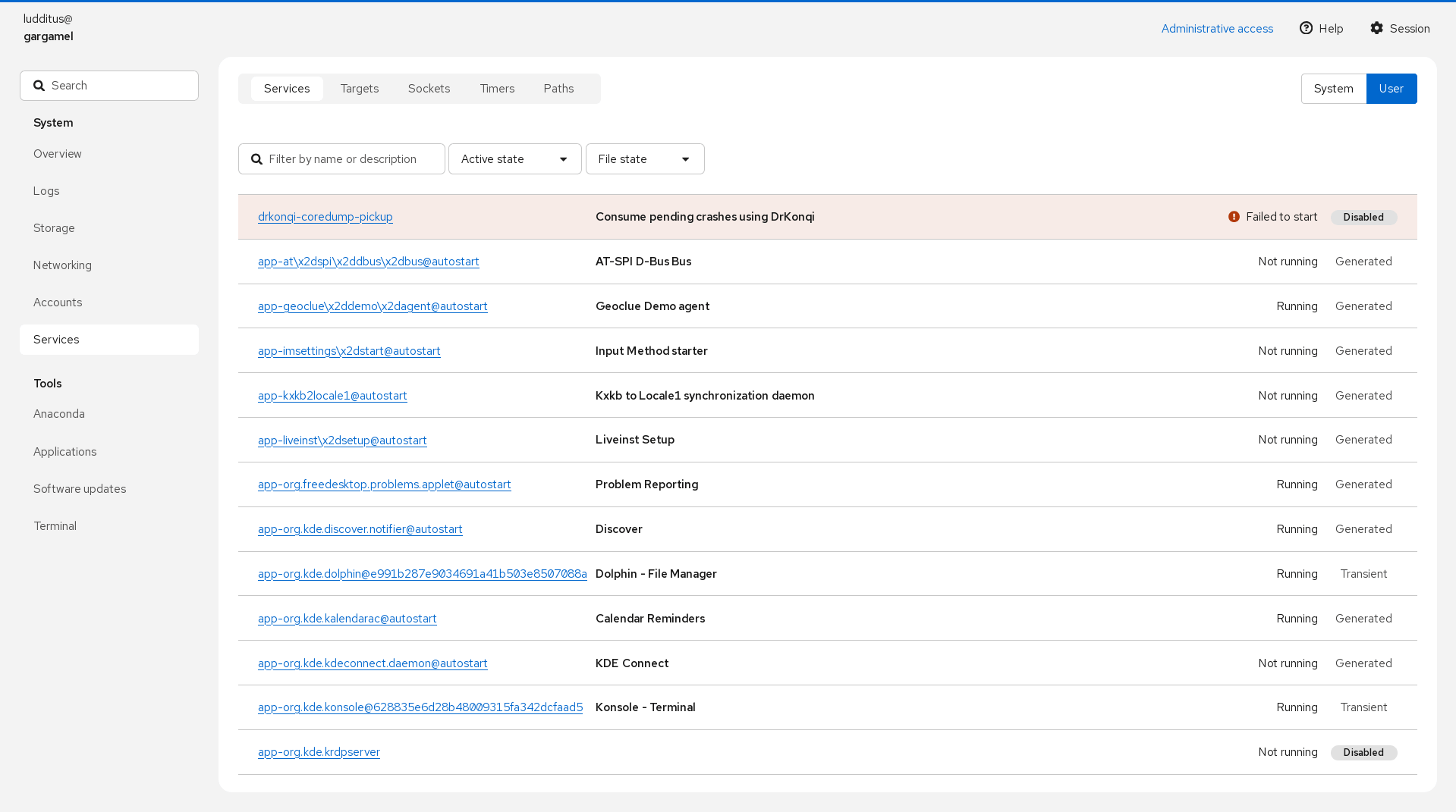 • Under KDE Plasma 5, you can then invoke it with kcmshell5 kcm_systemd, or you can find it in KDE System Settings, at the bottom of System Administration.