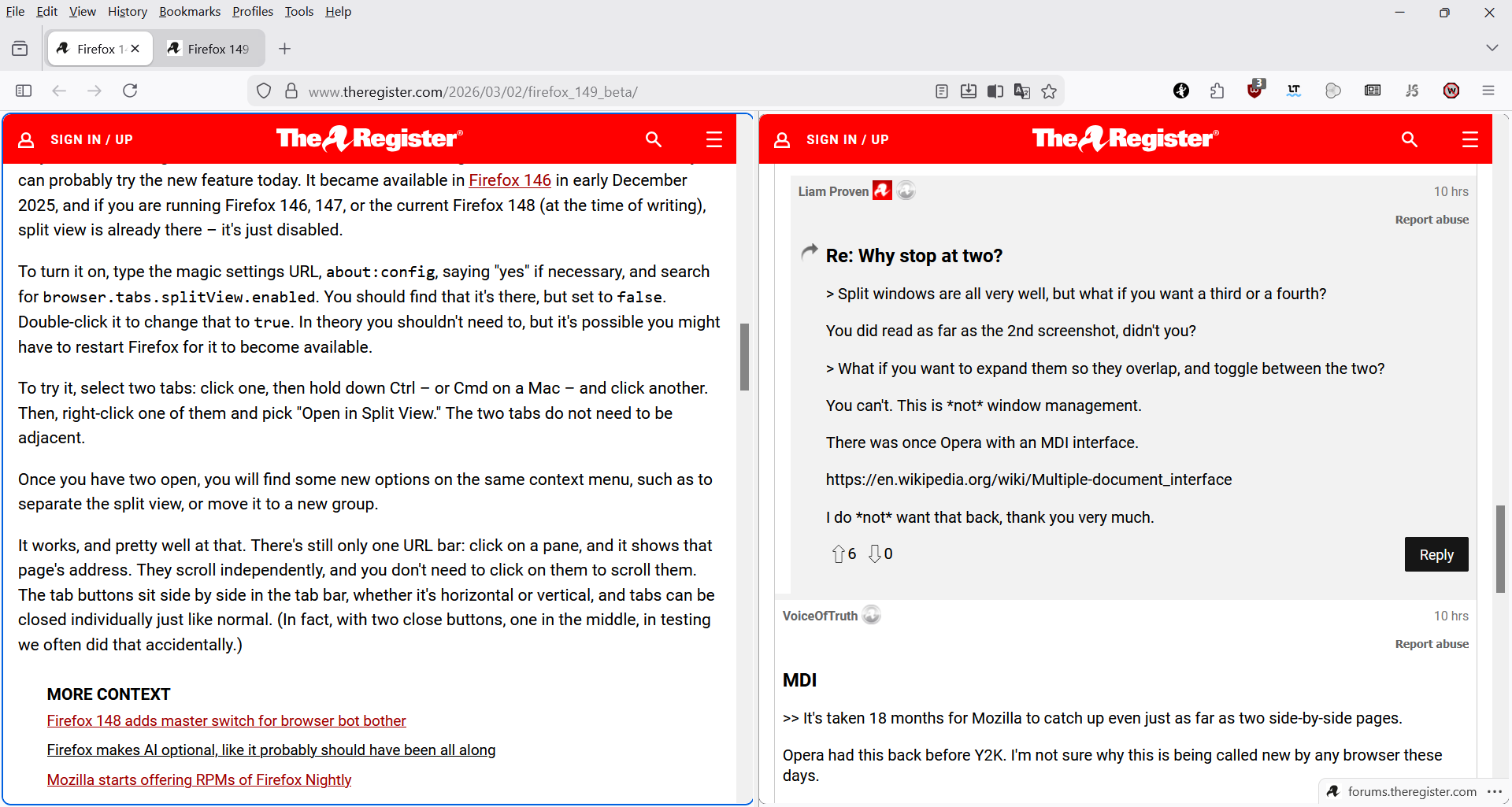 Liam Proven: Firefox 149 beta develops a split personality. Here’s the “split view” in Firefox 148: