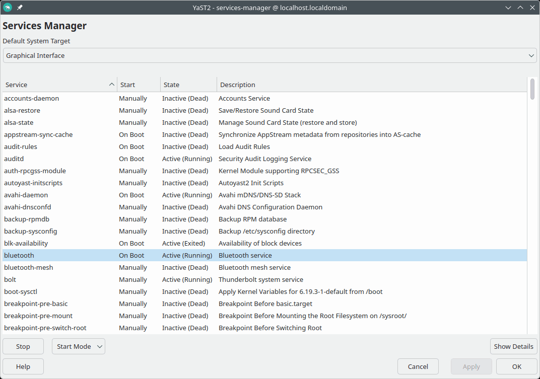 However, KDE Plasma 5 has a tool that’s called differently in different distros, but it’s the same thing: systemd-kcm in OpenMandriva, kcmsystemd in Mageia, kcm_systemd in Fedora and EPEL, kde-config-systemd in Debian and Ubuntu. Note that kde-config-systemd was removed from Debian 13, and there is a reason for that! Debian Bug #1095535 kde-config-systemd: Outdated, not compatible with plasma 6. So it was removed, as per Bug #1110504.