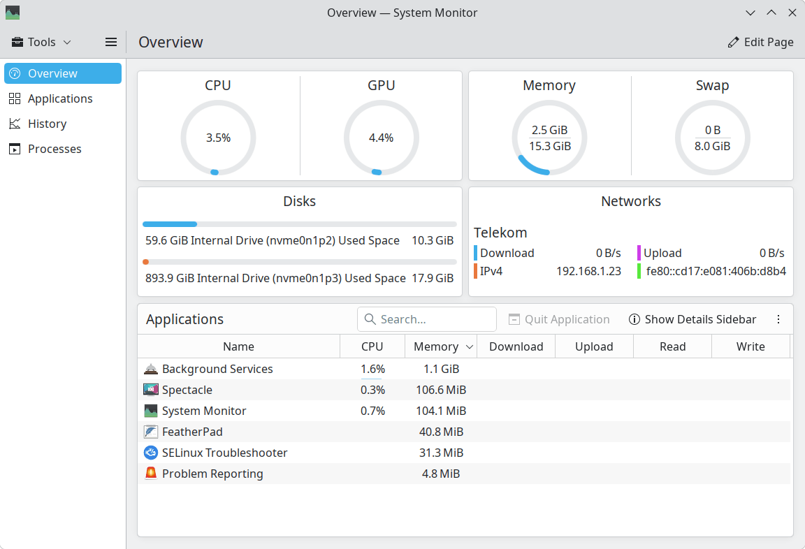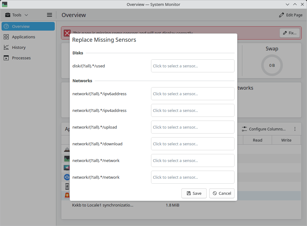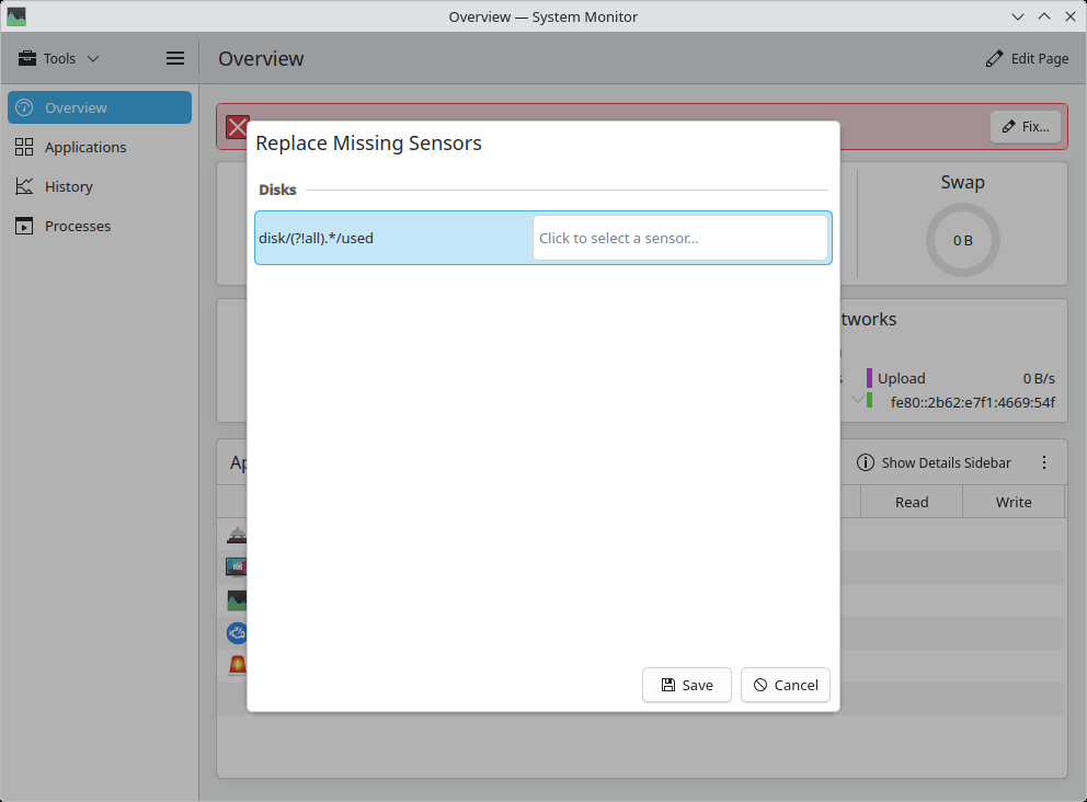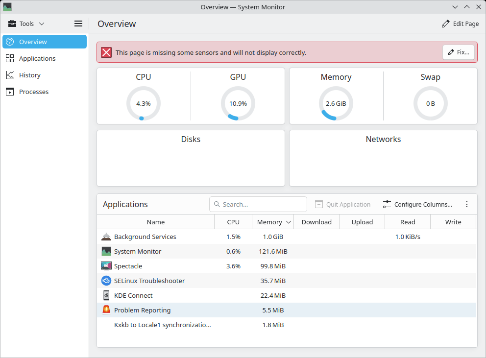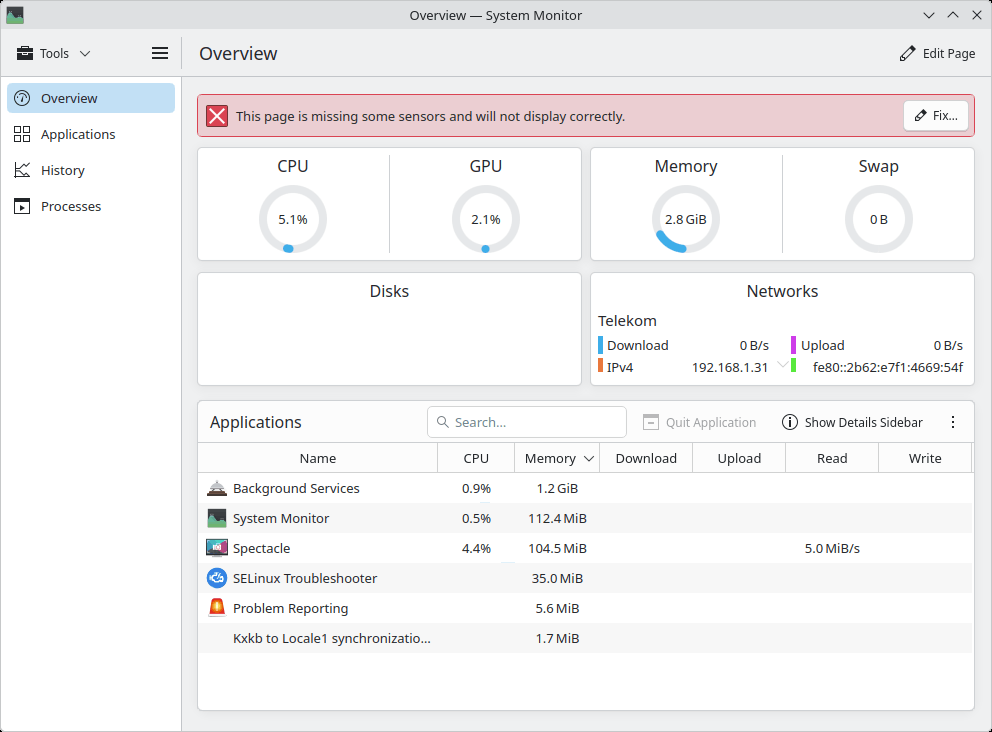 Then, the very first visible bug was the missing NVMe SSD “sensors” (is the disk space really measured by sensors?) in KDE’s System Monitor: