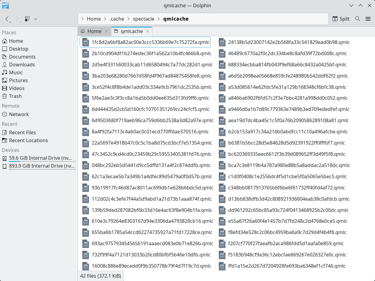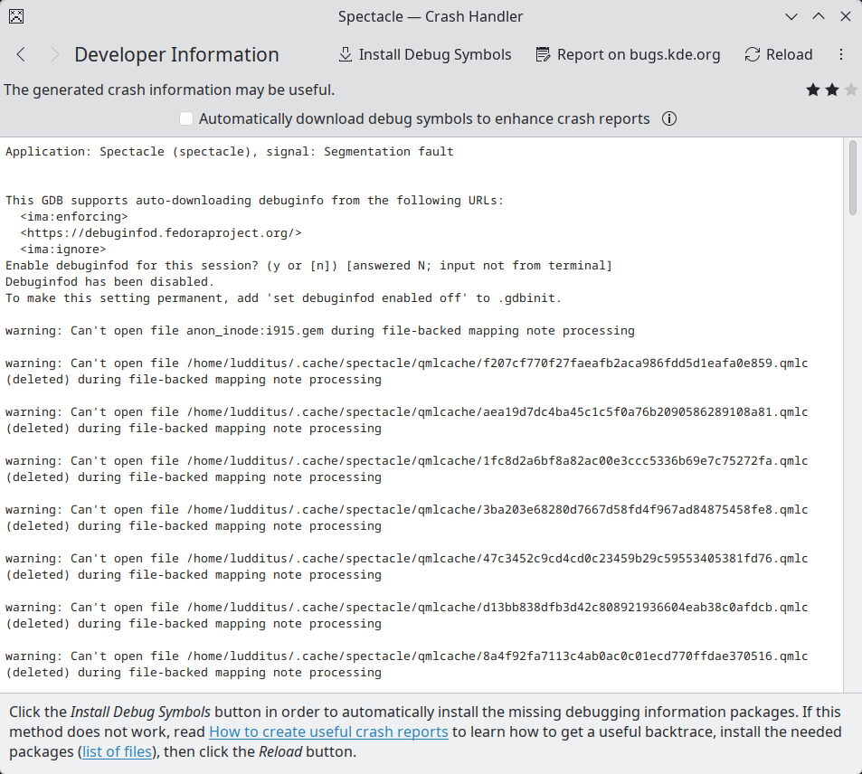 In one case, beyond the usual “Segmentation fault,” I noticed that it failed to open several ~/.cache/spectacle/qmlcache/*.qmlc files: