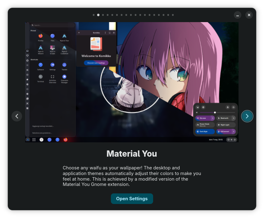 It’s a nice Arch-based distro, that features a nice set of applications. I personally like the themes and backgrounds (even though I hate GNOME). It boots up quicker than some other Arch-based distros (Even though it uses GNOME as the DE). I also like the Material UWU theme.