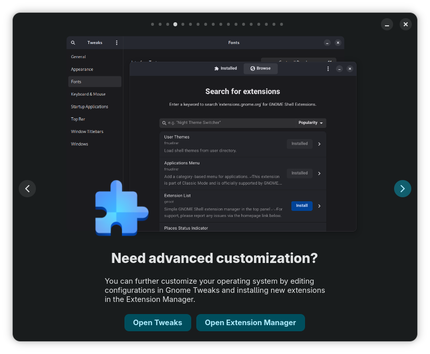 I also like the Nyarch customizer, because it makes GNOME usable especially if you are a Windows user.