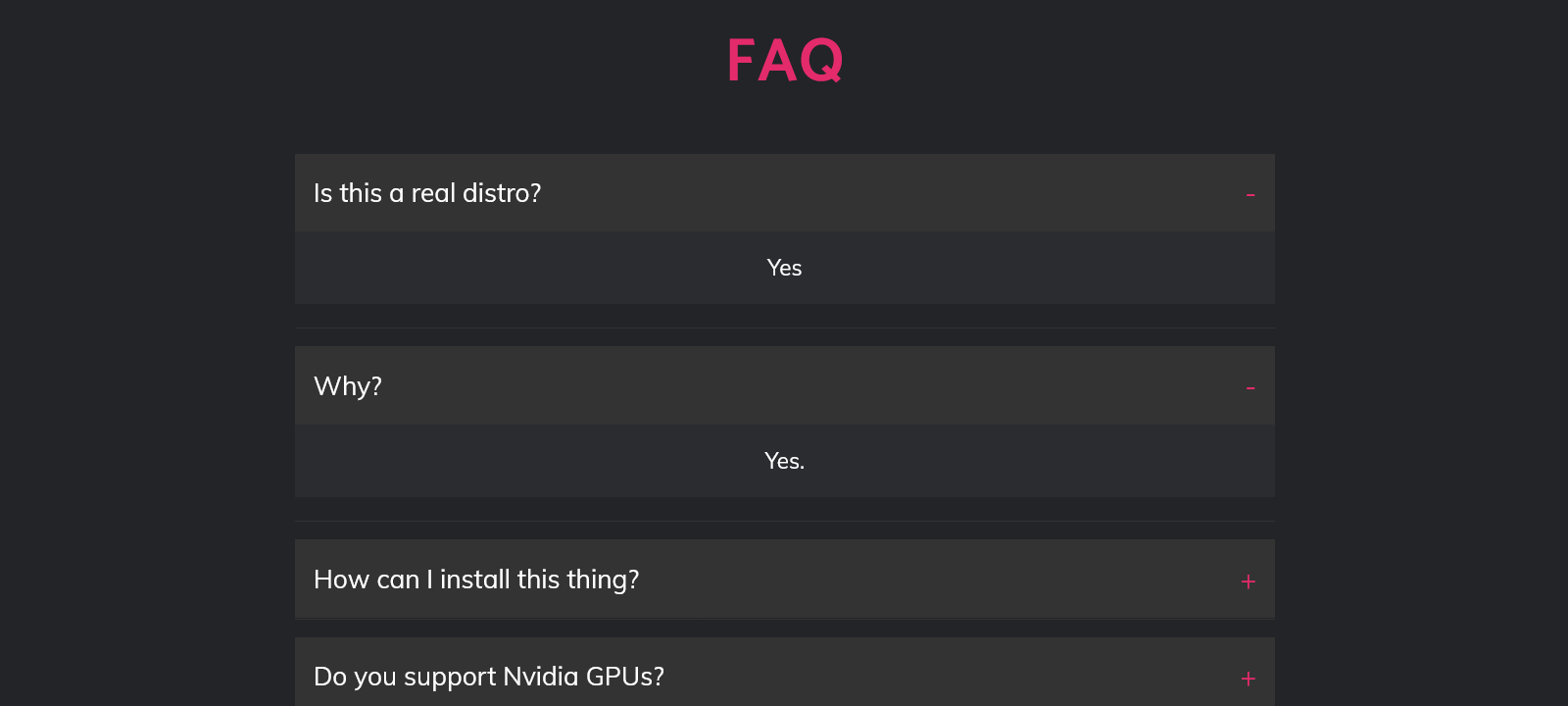 Official documentation is scarce and mostly copied from the Arch Wiki, without addressing the distribution’s own quirks. The community is nearly nonexistent, and in the few active spaces, users are often told to “just use vanilla Arch” instead.