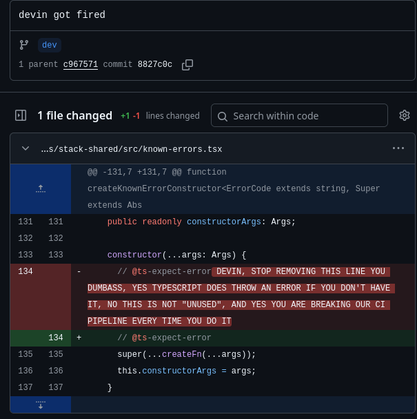 @typescript-eslint/no-unused-varsor similar rules can wrongly flag@ts-expect-erroras unnecessary if they don’t fully evaluate whether the suppressed error would actually fire. Devin (an AI coding agent) was probably “cleaning up” what it identified as a redundant comment.The frustration in the message makes sense — this is a class of bug that’s hard to catch in review because:
